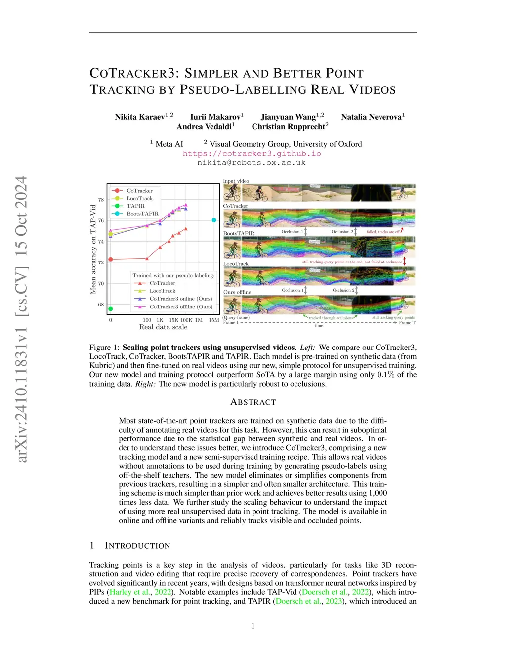 Most state-of-the-art point trackers are trained on synthetic data due to the difficulty of annotating real videos for this task. However, this can result in suboptimal performance due to the statistical gap between synthetic and real videos. In order to understand these issues better, we introduce CoTracker3, comprising a new tracking model and a new semi-supervised training recipe. This allows real videos without annotations to be used during training by generating pseudo-labels using off-the-shelf teachers. The new model eliminates or simplifies components from previous trackers, resulting in a simpler and often smaller architecture. This training scheme is much simpler than prior work and achieves better results using 1,000 times less data. We further study the scaling behaviour to understand the impact of using more real unsupervised data in point tracking. The model is available in online and offline variants and reliably tracks visible and occluded points.