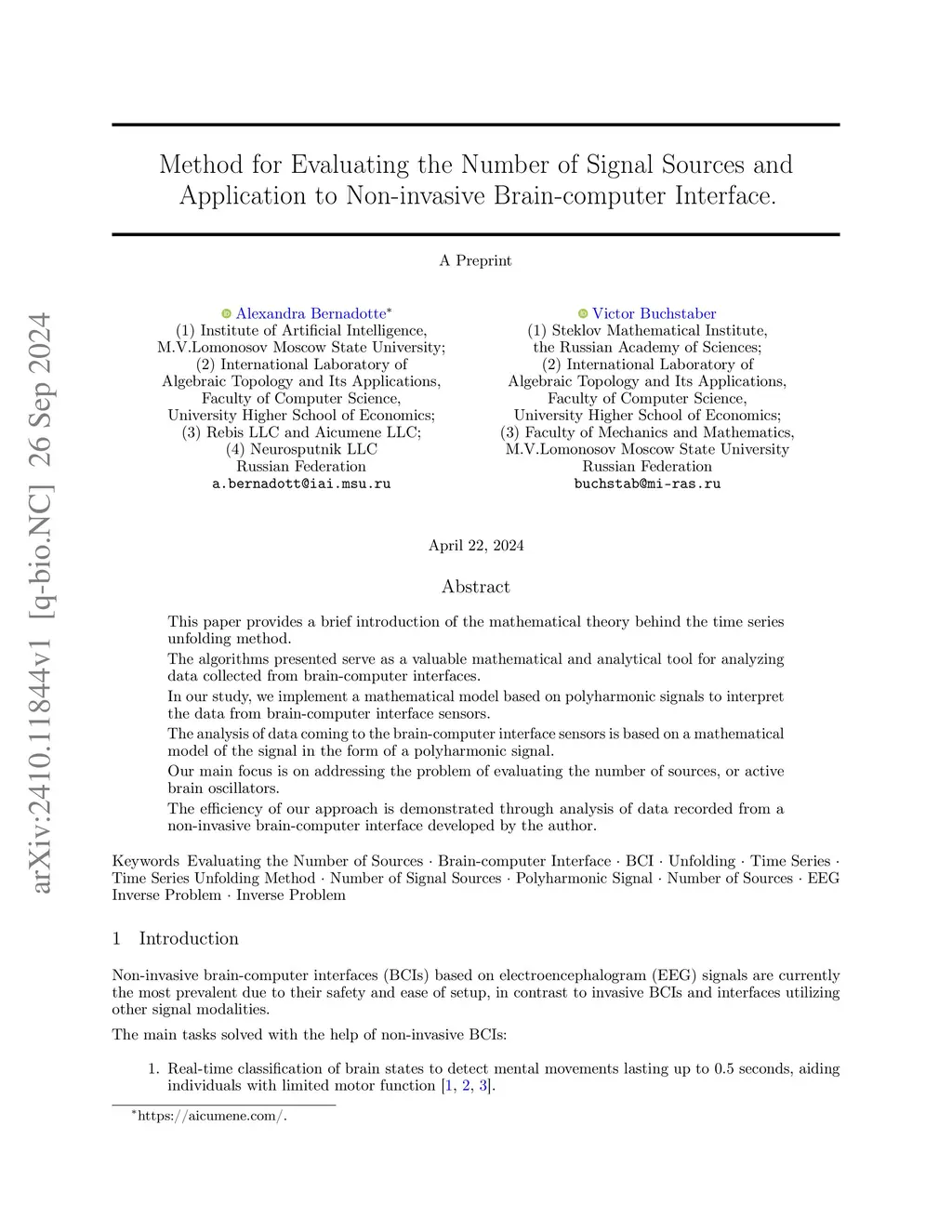 This paper provides a brief introduction of the mathematical theory behind the time series unfolding method. The algorithms presented serve as a valuable mathematical and analytical tool for analyzing data collected from brain-computer interfaces. In our study, we implement a mathematical model based on polyharmonic signals to interpret the data from brain-computer interface sensors. The analysis of data coming to the brain-computer interface sensors is based on a mathematical model of the signal in the form of a polyharmonic signal. Our main focus is on addressing the problem of evaluating the number of sources, or active brain oscillators. The efficiency of our approach is demonstrated through analysis of data recorded from a non-invasive brain-computer interface developed by the author.