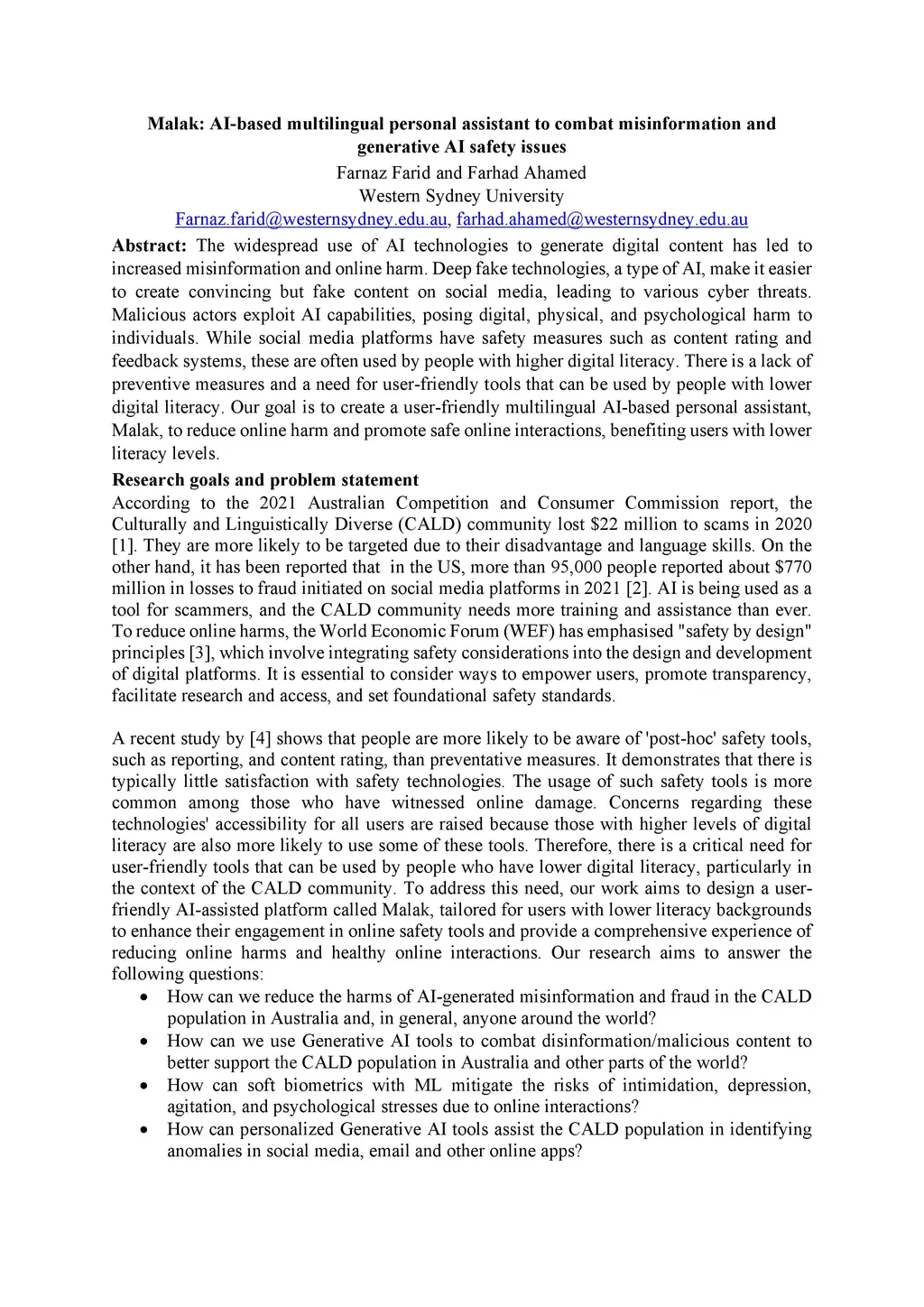 The widespread use of AI technologies to generate digital content has led to increased misinformation and online harm. Deep fake technologies, a type of AI, make it easier to create convincing but fake content on social media, leading to various cyber threats. Malicious actors exploit AI capabilities, posing digital, physical, and psychological harm to individuals. While social media platforms have safety measures such as content rating and feedback systems, these are often used by people with higher digital literacy. There is a lack of preventive measures and a need for user-friendly tools that can be used by people with lower digital literacy. Our goal is to create a user-friendly multilingual AI-based personal assistant, Malak, to reduce online harm and promote safe online interactions, benefiting users with lower literacy levels.
