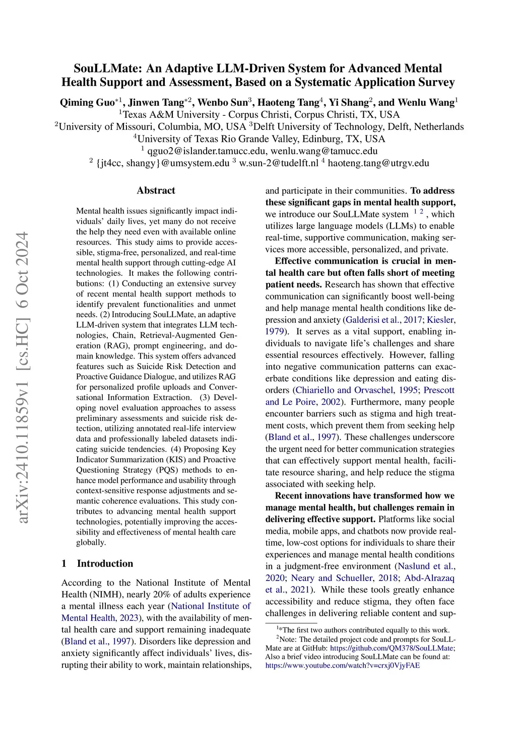 Mental health issues significantly impact individuals' daily lives, yet many do not receive the help they need even with available online resources. This study aims to provide accessible, stigma-free, personalized, and real-time mental health support through cutting-edge AI technologies. It makes the following contributions: (1) Conducting an extensive survey of recent mental health support methods to identify prevalent functionalities and unmet needs. (2) Introducing SouLLMate, an adaptive LLM-driven system that integrates LLM technologies, Chain, Retrieval-Augmented Generation (RAG), prompt engineering, and domain knowledge. This system offers advanced features such as Suicide Risk Detection and Proactive Guidance Dialogue, and utilizes RAG for personalized profile uploads and Conversational Information Extraction. (3) Developing novel evaluation approaches to assess preliminary assessments and suicide risk detection, utilizing annotated real-life interview data and professionally labeled datasets indicating suicide tendencies. (4) Proposing Key Indicator Summarization (KIS) and Proactive Questioning Strategy (PQS) methods to enhance model performance and usability through context-sensitive response adjustments and semantic coherence evaluations. This study contributes to advancing mental health support technologies, potentially improving the accessibility and effectiveness of mental health care globally.