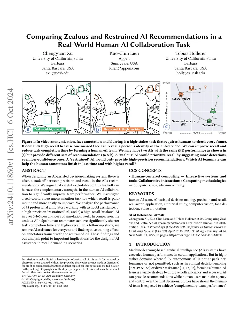 When designing an AI-assisted decision-making system, there is often a tradeoff between precision and recall in the AI's recommendations. We argue that careful exploitation of this tradeoff can harness the complementary strengths in the human-AI collaboration to significantly improve team performance. We investigate a real-world video anonymization task for which recall is paramount and more costly to improve. We analyze the performance of 78 professional annotators working with a) no AI assistance, b) a high-precision "restrained" AI, and c) a high-recall "zealous" AI in over 3,466 person-hours of annotation work. In comparison, the zealous AI helps human teammates achieve significantly shorter task completion time and higher recall. In a follow-up study, we remove AI assistance for everyone and find negative training effects on annotators trained with the restrained AI. These findings and our analysis point to important implications for the design of AI assistance in recall-demanding scenarios.