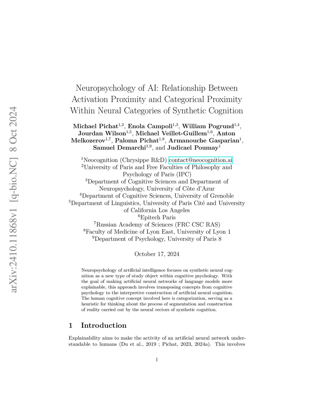Neuropsychology of artificial intelligence focuses on synthetic neural cog nition as a new type of study object within cognitive psychology. With the goal of making artificial neural networks of language models more explainable, this approach involves transposing concepts from cognitive psychology to the interpretive construction of artificial neural cognition. The human cognitive concept involved here is categorization, serving as a heuristic for thinking about the process of segmentation and construction of reality carried out by the neural vectors of synthetic cognition.