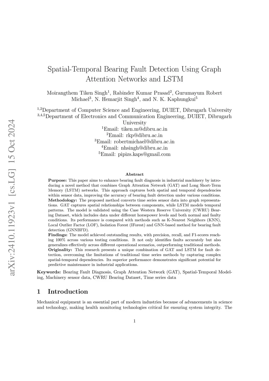 Purpose: This paper aims to enhance bearing fault diagnosis in industrial machinery by introducing a novel method that combines Graph Attention Network (GAT) and Long Short-Term Memory (LSTM) networks. This approach captures both spatial and temporal dependencies within sensor data, improving the accuracy of bearing fault detection under various conditions. Methodology: The proposed method converts time series sensor data into graph representations. GAT captures spatial relationships between components, while LSTM models temporal patterns. The model is validated using the Case Western Reserve University (CWRU) Bearing Dataset, which includes data under different horsepower levels and both normal and faulty conditions. Its performance is compared with methods such as K-Nearest Neighbors (KNN), Local Outlier Factor (LOF), Isolation Forest (IForest) and GNN-based method for bearing fault detection (GNNBFD). Findings: The model achieved outstanding results, with precision, recall, and F1-scores reaching 100\% across various testing conditions. It not only identifies faults accurately but also generalizes effectively across different operational scenarios, outperforming traditional methods. Originality: This research presents a unique combination of GAT and LSTM for fault detection, overcoming the limitations of traditional time series methods by capturing complex spatial-temporal dependencies. Its superior performance demonstrates significant potential for predictive maintenance in industrial applications.