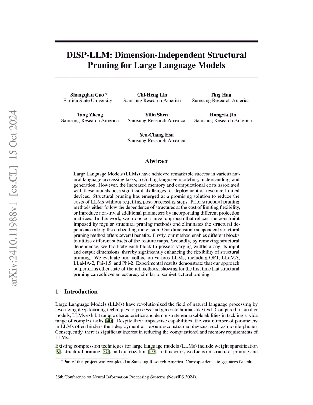 DISP-LLM: Dimension-Independent Structural Pruning for Large Language