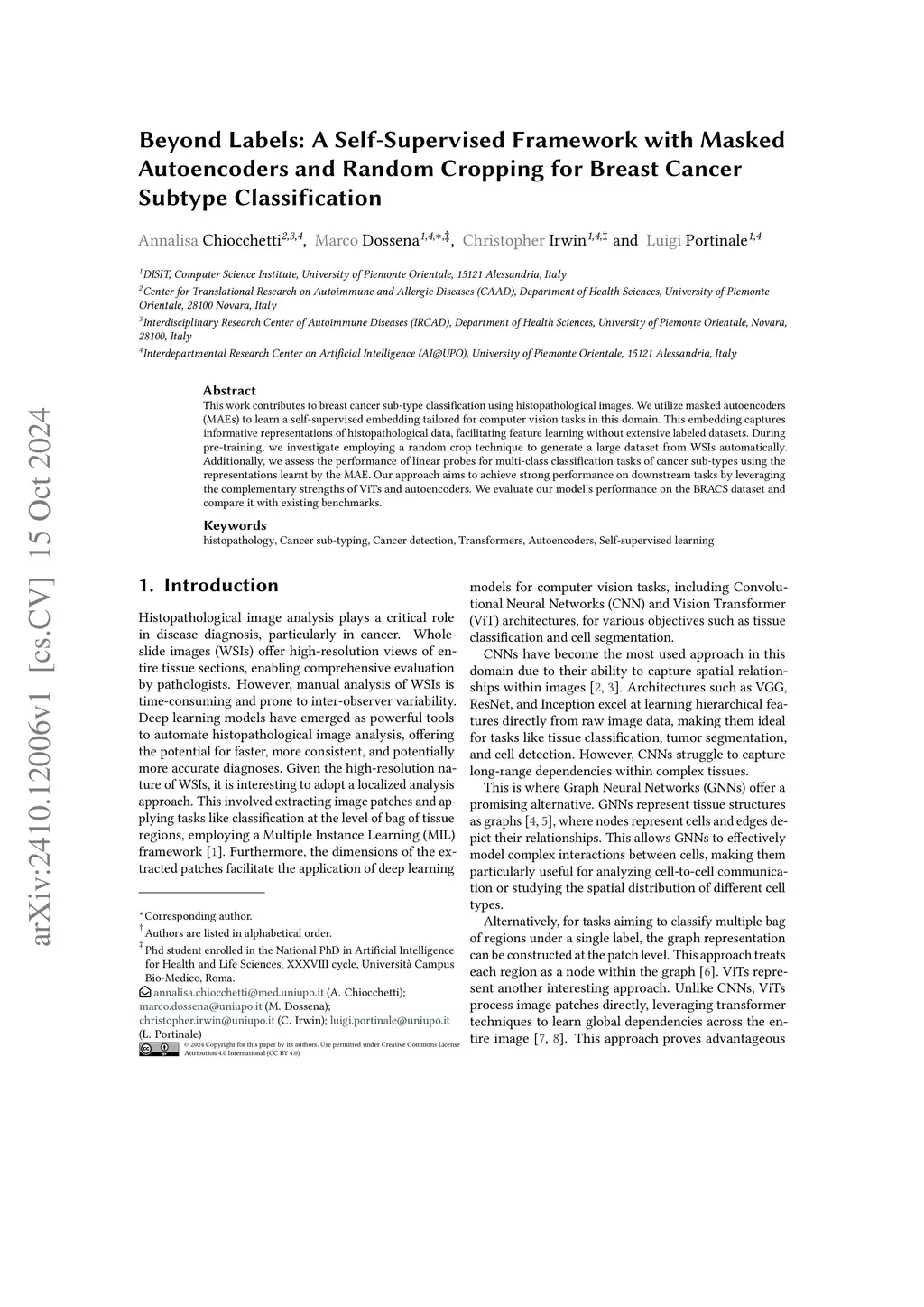 This work contributes to breast cancer sub-type classification using histopathological images. We utilize masked autoencoders (MAEs) to learn a self-supervised embedding tailored for computer vision tasks in this domain. This embedding captures informative representations of histopathological data, facilitating feature learning without extensive labeled datasets. During pre-training, we investigate employing a random crop technique to generate a large dataset from WSIs automatically. Additionally, we assess the performance of linear probes for multi-class classification tasks of cancer sub-types using the representations learnt by the MAE. Our approach aims to achieve strong performance on downstream tasks by leveraging the complementary strengths of ViTs and autoencoders. We evaluate our model's performance on the BRACS dataset and compare it with existing benchmarks.