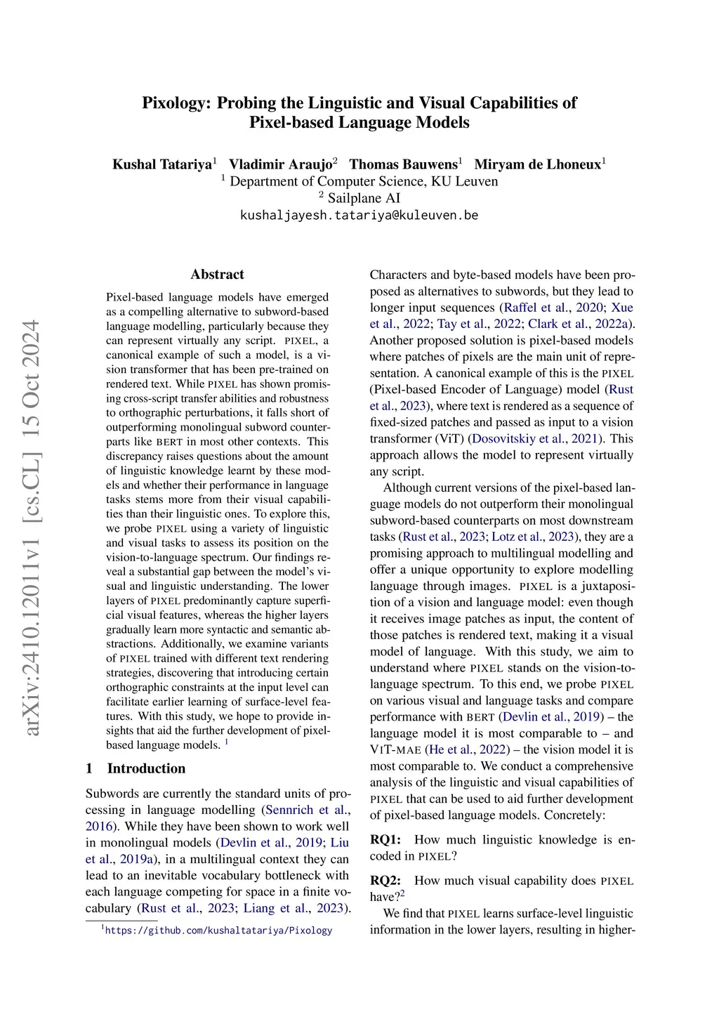 Pixology: Probing the Linguistic and Visual Capabilities of Pixel-based