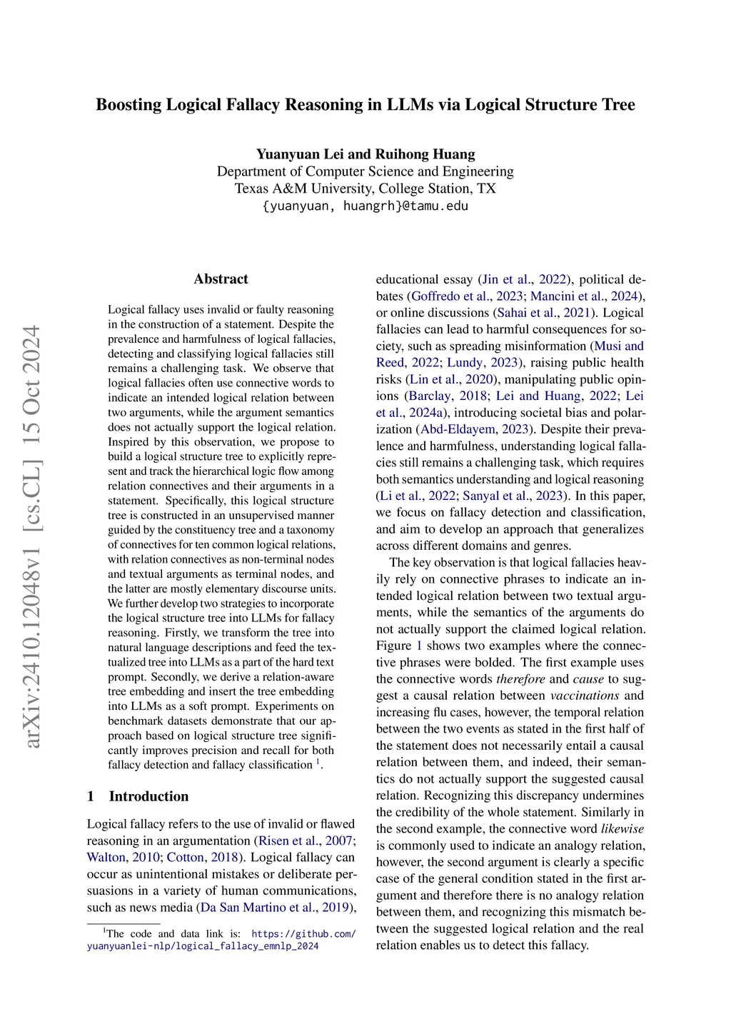 Logical fallacy uses invalid or faulty reasoning in the construction of a statement. Despite the prevalence and harmfulness of logical fallacies, detecting and classifying logical fallacies still remains a challenging task. We observe that logical fallacies often use connective words to indicate an intended logical relation between two arguments, while the argument semantics does not actually support the logical relation. Inspired by this observation, we propose to build a logical structure tree to explicitly represent and track the hierarchical logic flow among relation connectives and their arguments in a statement. Specifically, this logical structure tree is constructed in an unsupervised manner guided by the constituency tree and a taxonomy of connectives for ten common logical relations, with relation connectives as non-terminal nodes and textual arguments as terminal nodes, and the latter are mostly elementary discourse units. We further develop two strategies to incorporate the logical structure tree into LLMs for fallacy reasoning. Firstly, we transform the tree into natural language descriptions and feed the textualized tree into LLMs as a part of the hard text prompt. Secondly, we derive a relation-aware tree embedding and insert the tree embedding into LLMs as a soft prompt. Experiments on benchmark datasets demonstrate that our approach based on logical structure tree significantly improves precision and recall for both fallacy detection and fallacy classification.