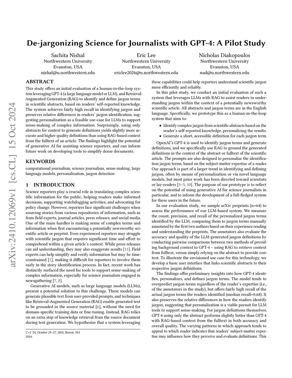 This study offers an initial evaluation of a human-in-the-loop system leveraging GPT-4 (a large language model or LLM), and Retrieval-Augmented Generation (RAG) to identify and define jargon terms in scientific abstracts, based on readers' self-reported knowledge. The system achieves fairly high recall in identifying jargon and preserves relative differences in readers' jargon identification, suggesting personalization as a feasible use-case for LLMs to support sense-making of complex information. Surprisingly, using only abstracts for context to generate definitions yields slightly more accurate and higher quality definitions than using RAG-based context from the fulltext of an article. The findings highlight the potential of generative AI for assisting science reporters, and can inform future work on developing tools to simplify dense documents.