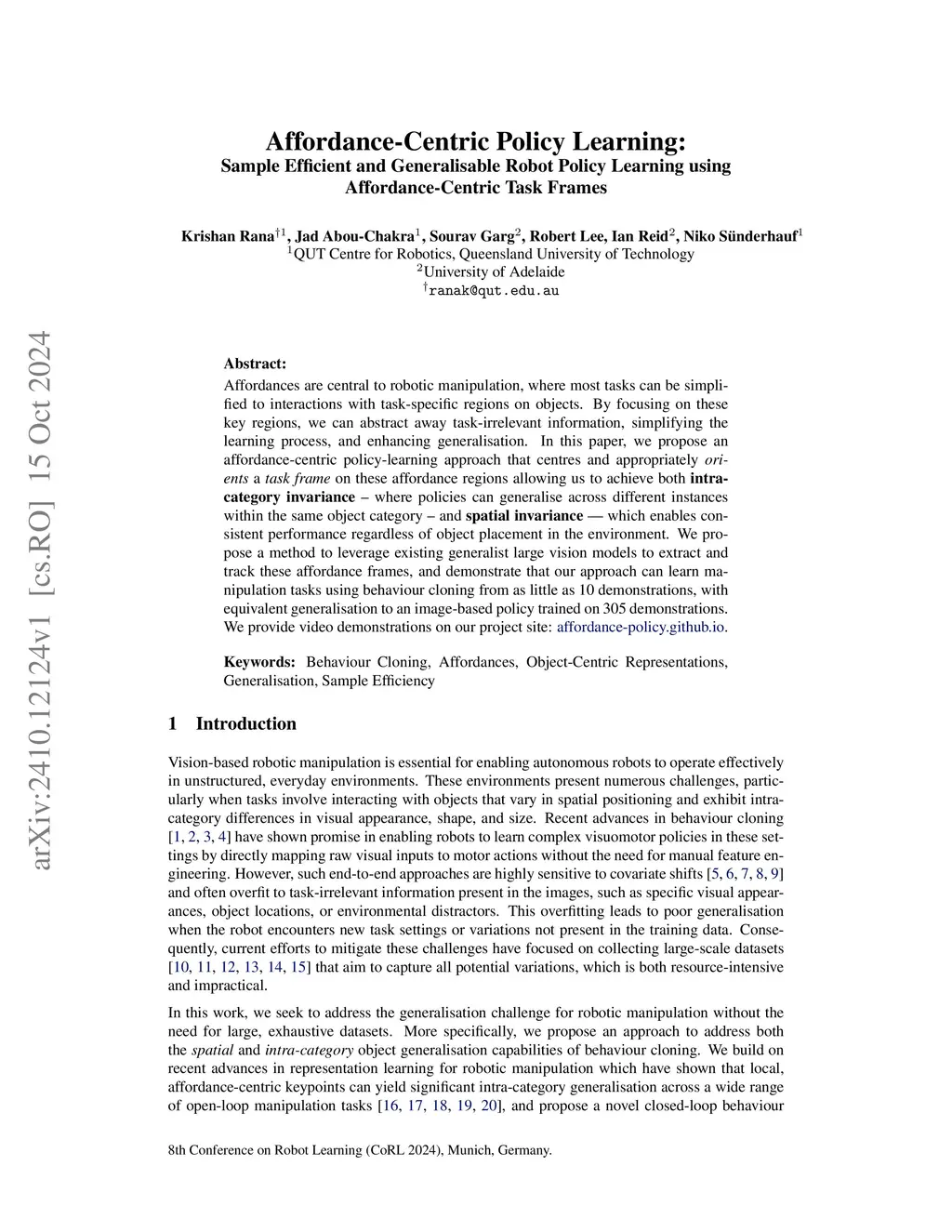 Learning from 10 Demos: Generalisable and Sample-Efficient Policy Learning with Oriented Affordance Frames