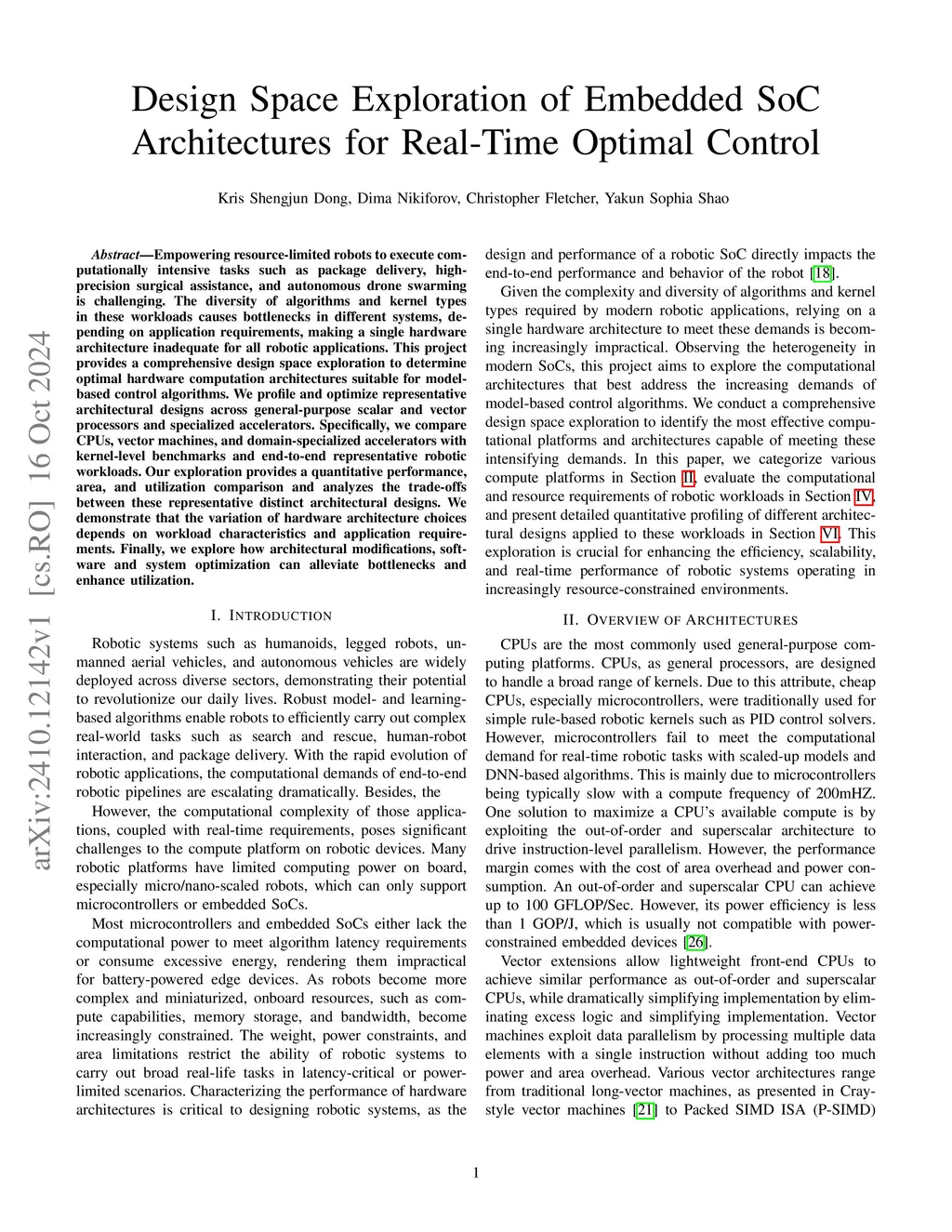 Resource-limited robots face significant challenges in executing computationally intensive tasks, such as locomotion and manipulation, particularly for real-time optimal control algorithms like Model Predictive Control (MPC). This paper provides a comprehensive design space exploration to identify optimal hardware computation architectures for these demanding model-based control algorithms. We profile and optimize representative architectural designs, including general-purpose scalar CPUs, vector processors, and specialized accelerators. By characterizing kernel-level benchmarks and end-to-end robotic scenarios, including a hardware-in-the-loop evaluation on a fabricated RISC-V multi-core vector SoC, we present a quantitative comparison of performance, area, and utilization across distinct architectural design points. Our findings demonstrate that targeted architectural modifications, coupled with deep software and system optimizations, enable up to 3.71x speedups for MPC, resulting in up to 27% system-level power reductions while completing robotic tasks. Finally, we propose a code generation flow designed to simplify the complex engineering effort required for mapping robotic workloads onto specialized architectures.