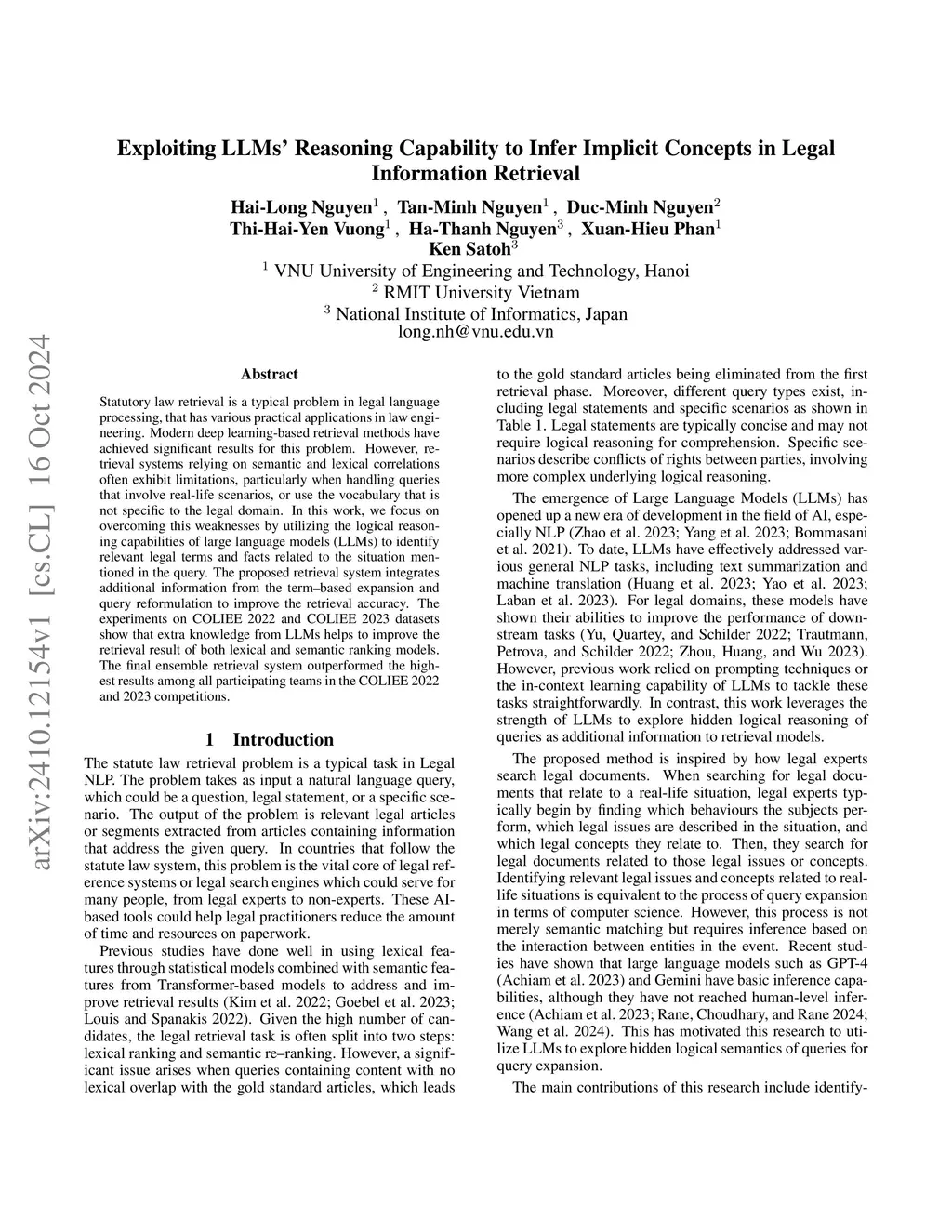 Statutory law retrieval is a typical problem in legal language processing, that has various practical applications in law engineering. Modern deep learning-based retrieval methods have achieved significant results for this problem. However, retrieval systems relying on semantic and lexical correlations often exhibit limitations, particularly when handling queries that involve real-life scenarios, or use the vocabulary that is not specific to the legal domain. In this work, we focus on overcoming this weaknesses by utilizing the logical reasoning capabilities of large language models (LLMs) to identify relevant legal terms and facts related to the situation mentioned in the query. The proposed retrieval system integrates additional information from the term--based expansion and query reformulation to improve the retrieval accuracy. The experiments on COLIEE 2022 and COLIEE 2023 datasets show that extra knowledge from LLMs helps to improve the retrieval result of both lexical and semantic ranking models. The final ensemble retrieval system outperformed the highest results among all participating teams in the COLIEE 2022 and 2023 competitions.