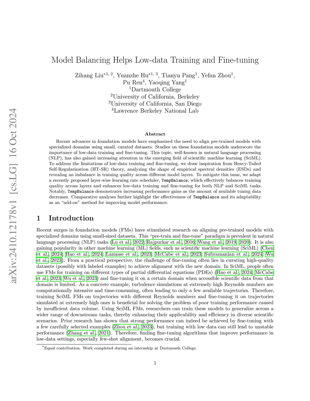 Recent advances in foundation models have emphasized the need to align pre-trained models with specialized domains using small, curated datasets. Studies on these foundation models underscore the importance of low-data training and fine-tuning. This topic, well-known in natural language processing (NLP), has also gained increasing attention in the emerging field of scientific machine learning (SciML). To address the limitations of low-data training and fine-tuning, we draw inspiration from Heavy-Tailed Self-Regularization (HT-SR) theory, analyzing the shape of empirical spectral densities (ESDs) and revealing an imbalance in training quality across different model layers. To mitigate this issue, we adapt a recently proposed layer-wise learning rate scheduler, TempBalance, which effectively balances training quality across layers and enhances low-data training and fine-tuning for both NLP and SciML tasks. Notably, TempBalance demonstrates increasing performance gains as the amount of available tuning data decreases. Comparative analyses further highlight the effectiveness of TempBalance and its adaptability as an "add-on" method for improving model performance.
