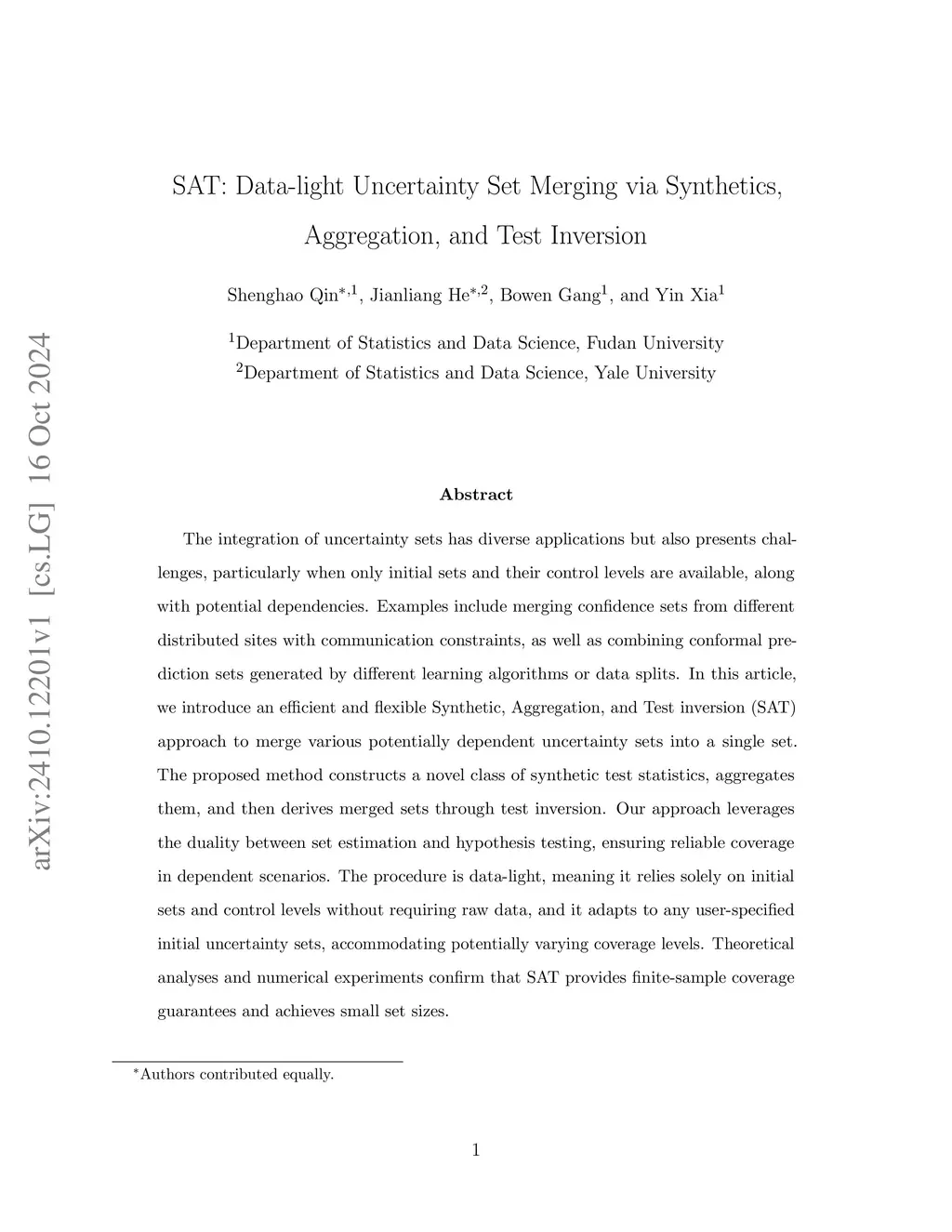 This article introduces a Synthetics, Aggregation, and Test inversion (SAT) approach for merging diverse and potentially dependent uncertainty sets into a single unified set. The procedure is data-light, relying only on initial sets and their nominal levels, and it flexibly adapts to user-specified input sets with possibly varying coverage guarantees. SAT is motivated by the challenge of integrating uncertainty sets when only the initial sets and their control levels are available-for example, when merging confidence sets from distributed sites under communication constraints or combining conformal prediction sets generated by different algorithms or data splits. To address this, SAT constructs and aggregates novel synthetic test statistics, and then derive merged sets through test inversion. Our method leverages the duality between set estimation and hypothesis testing, ensuring reliable coverage in dependent scenarios. A key theoretical contribution is a rigorous analysis of SAT's properties, including its admissibility in the context of deterministic set merging. Both theoretical analyses and empirical results confirm the method's finite-sample coverage validity and desirable set sizes.