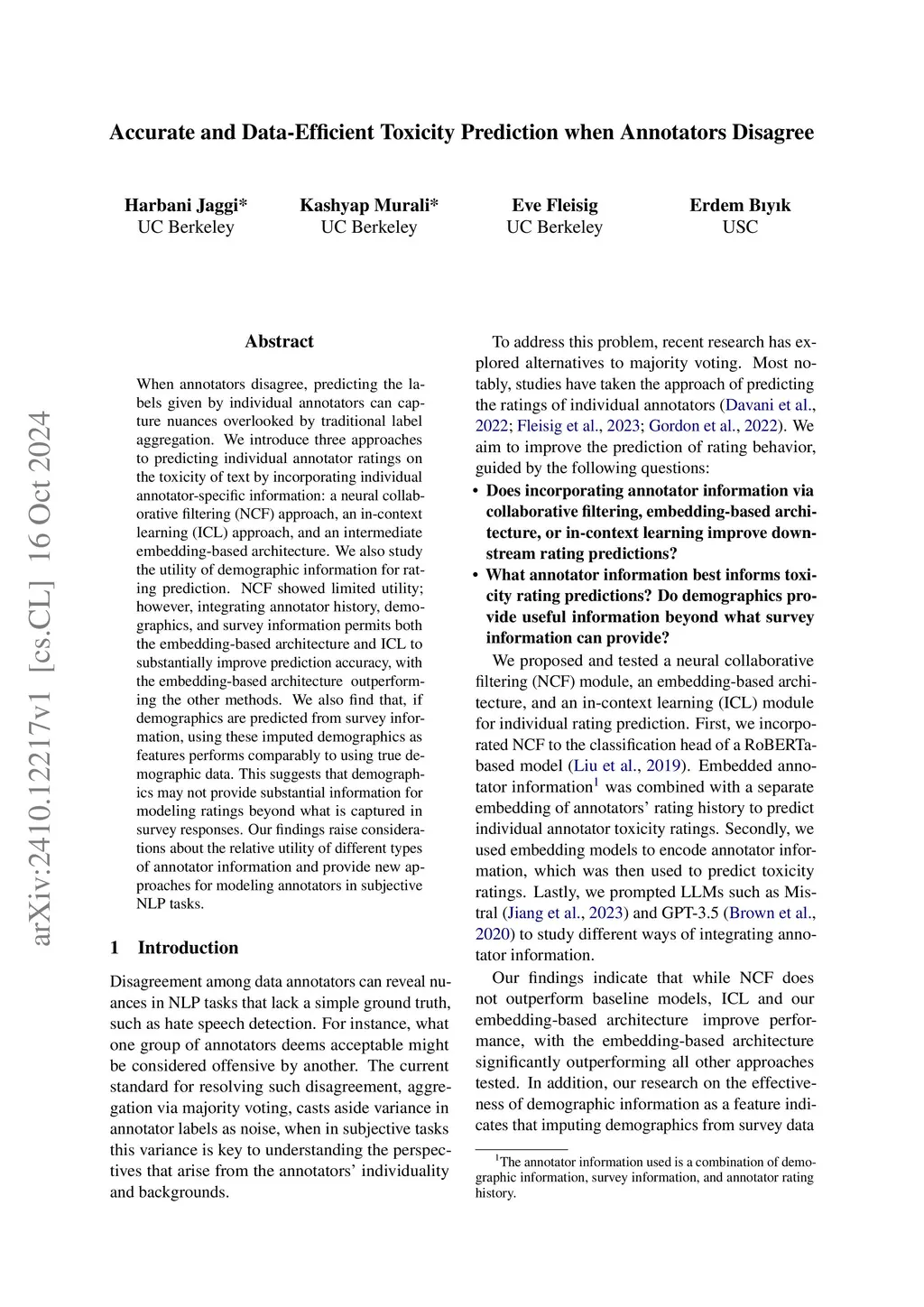 When annotators disagree, predicting the labels given by individual annotators can capture nuances overlooked by traditional label aggregation. We introduce three approaches to predicting individual annotator ratings on the toxicity of text by incorporating individual annotator-specific information: a neural collaborative filtering (NCF) approach, an in-context learning (ICL) approach, and an intermediate embedding-based architecture. We also study the utility of demographic information for rating prediction. NCF showed limited utility; however, integrating annotator history, demographics, and survey information permits both the embedding-based architecture and ICL to substantially improve prediction accuracy, with the embedding-based architecture outperforming the other methods. We also find that, if demographics are predicted from survey information, using these imputed demographics as features performs comparably to using true demographic data. This suggests that demographics may not provide substantial information for modeling ratings beyond what is captured in survey responses. Our findings raise considerations about the relative utility of different types of annotator information and provide new approaches for modeling annotators in subjective NLP tasks.