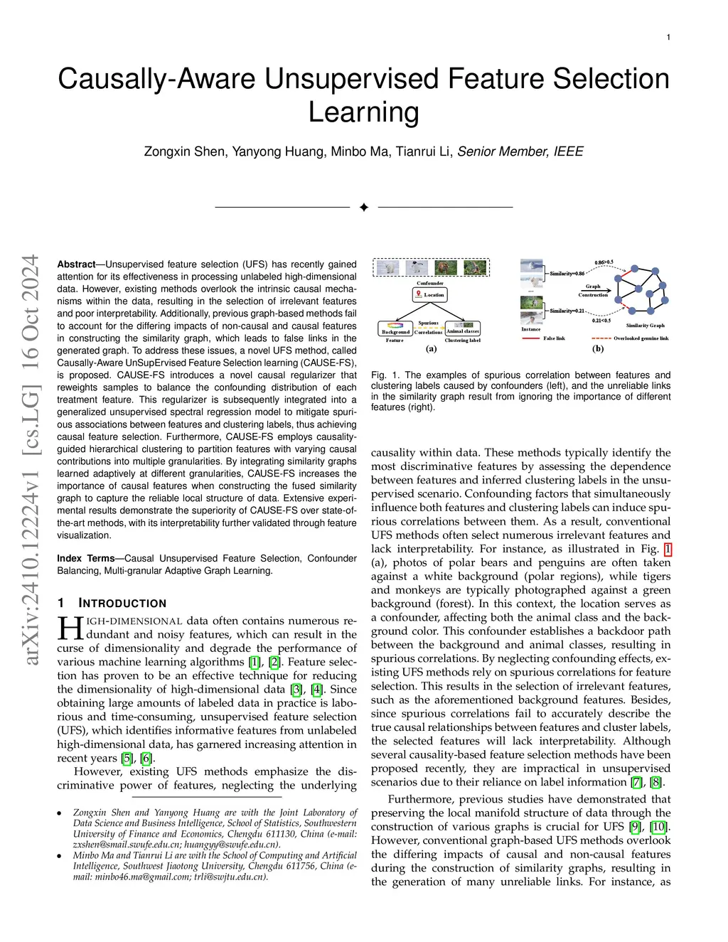 Unsupervised feature selection (UFS) has recently gained attention for its effectiveness in processing unlabeled high-dimensional data. However, existing methods overlook the intrinsic causal mechanisms within the data, resulting in the selection of irrelevant features and poor interpretability. Additionally, previous graph-based methods fail to account for the differing impacts of non-causal and causal features in constructing the similarity graph, which leads to false links in the generated graph. To address these issues, a novel UFS method, called Causally-Aware UnSupErvised Feature Selection learning (CAUSE-FS), is proposed. CAUSE-FS introduces a novel causal regularizer that reweights samples to balance the confounding distribution of each treatment feature. This regularizer is subsequently integrated into a generalized unsupervised spectral regression model to mitigate spurious associations between features and clustering labels, thus achieving causal feature selection. Furthermore, CAUSE-FS employs causality-guided hierarchical clustering to partition features with varying causal contributions into multiple granularities. By integrating similarity graphs learned adaptively at different granularities, CAUSE-FS increases the importance of causal features when constructing the fused similarity graph to capture the reliable local structure of data. Extensive experimental results demonstrate the superiority of CAUSE-FS over state-of-the-art methods, with its interpretability further validated through feature visualization.