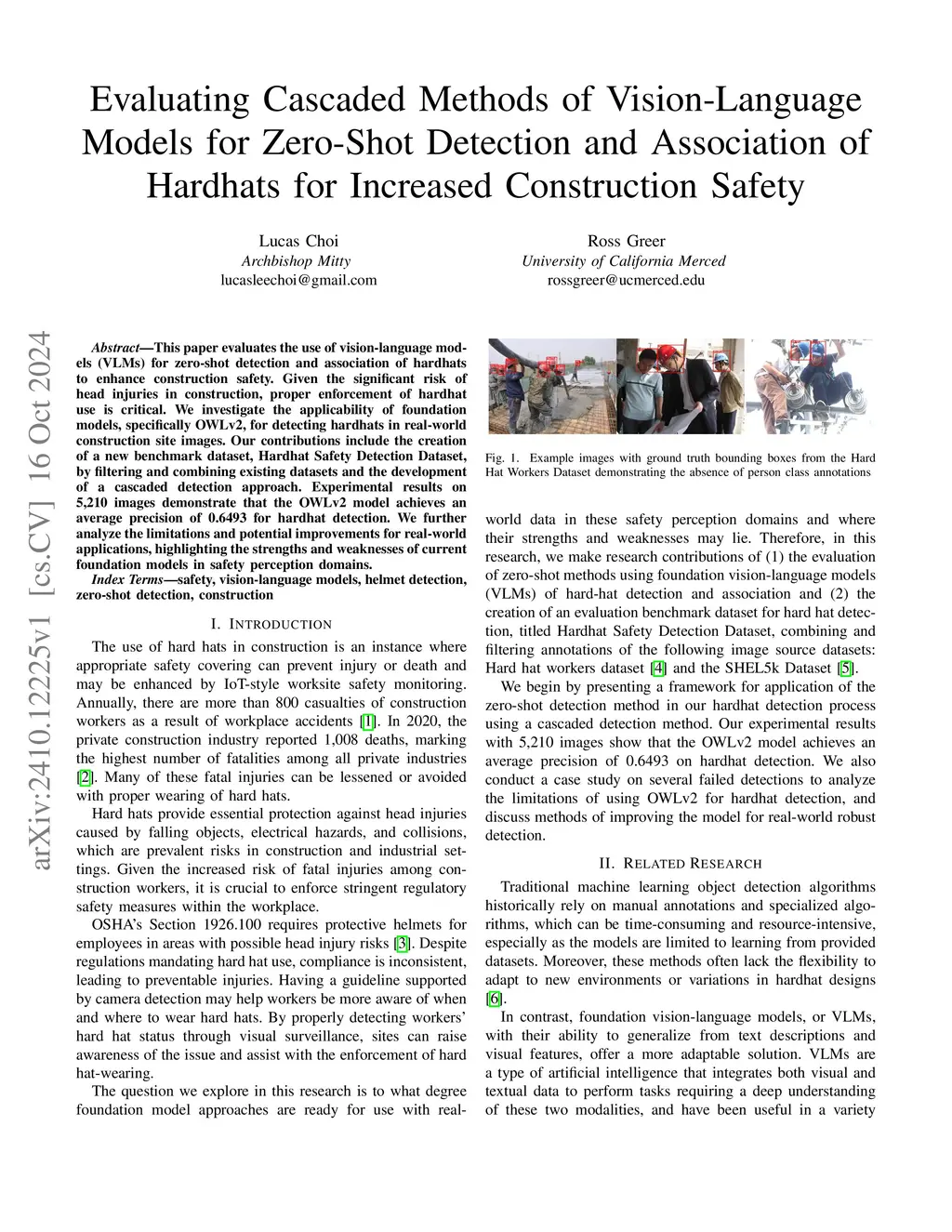 This paper evaluates the use of vision-language models (VLMs) for zero-shot detection and association of hardhats to enhance construction safety. Given the significant risk of head injuries in construction, proper enforcement of hardhat use is critical. We investigate the applicability of foundation models, specifically OWLv2, for detecting hardhats in real-world construction site images. Our contributions include the creation of a new benchmark dataset, Hardhat Safety Detection Dataset, by filtering and combining existing datasets and the development of a cascaded detection approach. Experimental results on 5,210 images demonstrate that the OWLv2 model achieves an average precision of 0.6493 for hardhat detection. We further analyze the limitations and potential improvements for real-world applications, highlighting the strengths and weaknesses of current foundation models in safety perception domains.