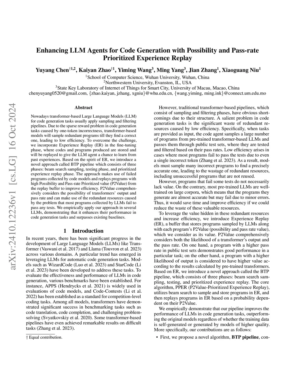 Nowadays transformer-based Large Language Models (LLM) for code generation tasks usually apply sampling and filtering pipelines. Due to the sparse reward problem in code generation tasks caused by one-token incorrectness, transformer-based models will sample redundant programs till they find a correct one, leading to low efficiency. To overcome the challenge, we incorporate Experience Replay (ER) in the fine-tuning phase, where codes and programs produced are stored and will be replayed to give the LLM agent a chance to learn from past experiences. Based on the spirit of ER, we introduce a novel approach called BTP pipeline which consists of three phases: beam search sampling, testing phase, and prioritized experience replay phase. The approach makes use of failed programs collected by code models and replays programs with high Possibility and Pass-rate Prioritized value (P2Value) from the replay buffer to improve efficiency. P2Value comprehensively considers the possibility of transformers' output and pass rate and can make use of the redundant resources caused by the problem that most programs collected by LLMs fail to pass any tests. We empirically apply our approach in several LLMs, demonstrating that it enhances their performance in code generation tasks and surpasses existing baselines.