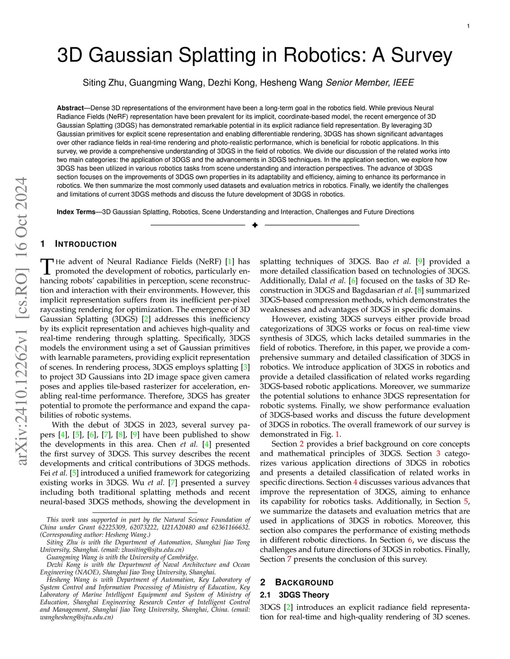 Dense 3D representations of the environment have been a long-term goal in the robotics field. While previous Neural Radiance Fields (NeRF) representation have been prevalent for its implicit, coordinate-based model, the recent emergence of 3D Gaussian Splatting (3DGS) has demonstrated remarkable potential in its explicit radiance field representation. By leveraging 3D Gaussian primitives for explicit scene representation and enabling differentiable rendering, 3DGS has shown significant advantages over other radiance fields in real-time rendering and photo-realistic performance, which is beneficial for robotic applications. In this survey, we provide a comprehensive understanding of 3DGS in the field of robotics. We divide our discussion of the related works into two main categories: the application of 3DGS and the advancements in 3DGS techniques. In the application section, we explore how 3DGS has been utilized in various robotics tasks from scene understanding and interaction perspectives. The advance of 3DGS section focuses on the improvements of 3DGS own properties in its adaptability and efficiency, aiming to enhance its performance in robotics. We then summarize the most commonly used datasets and evaluation metrics in robotics. Finally, we identify the challenges and limitations of current 3DGS methods and discuss the future development of 3DGS in robotics.