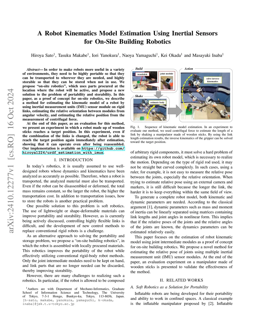 In order to make robots more useful in a variety of environments, they need to be highly portable so that they can be transported to wherever they are needed, and highly storable so that they can be stored when not in use. We propose "on-site robotics", which uses parts procured at the location where the robot will be active, and propose a new solution to the problem of portability and storability. In this paper, as a proof of concept for on-site robotics, we describe a method for estimating the kinematic model of a robot by using inertial measurement units (IMU) sensor module on rigid links, estimating the relative orientation between modules from angular velocity, and estimating the relative position from the measurement of centrifugal force. At the end of this paper, as an evaluation for this method, we present an experiment in which a robot made up of wooden sticks reaches a target position. In this experiment, even if the combination of the links is changed, the robot is able to reach the target position again immediately after estimation, showing that it can operate even after being reassembled. Our implementation is available on https://github.com/hiroya1224/urdf_estimation_with_imus .