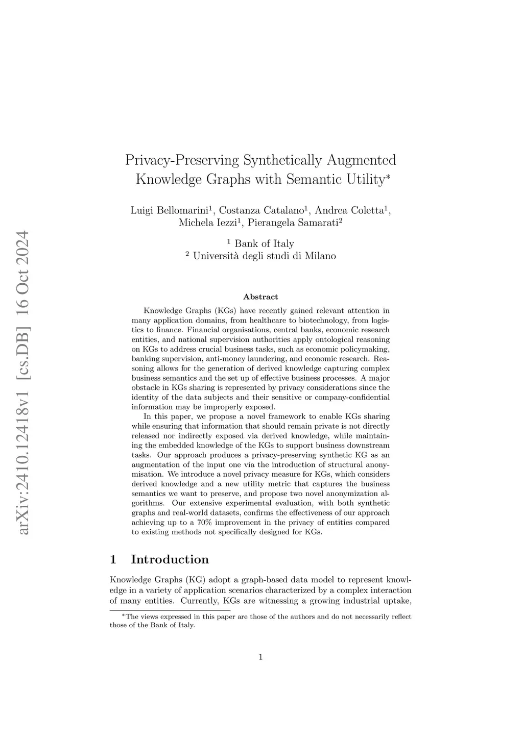 We propose a novel framework to enable Knowledge Graphs (KGs) sharing while ensuring that information that should remain private is not directly released nor indirectly exposed via derived knowledge, maintaining at the same time the embedded knowledge of the KGs to support business downstream tasks. Our approach produces a privacy-preserving KG as an augmentation of the input one via controlled addition of nodes and edges as well as re-labeling of nodes and perturbation of weights. We introduce a novel privacy measure for KGs, which considers derived knowledge, a new utility metric that captures the business semantics we want to preserve, and propose two novel anonymisation algorithms. Our extensive experimental evaluation, with both synthetic graphs and real-world datasets, confirms the effectiveness of our approach.