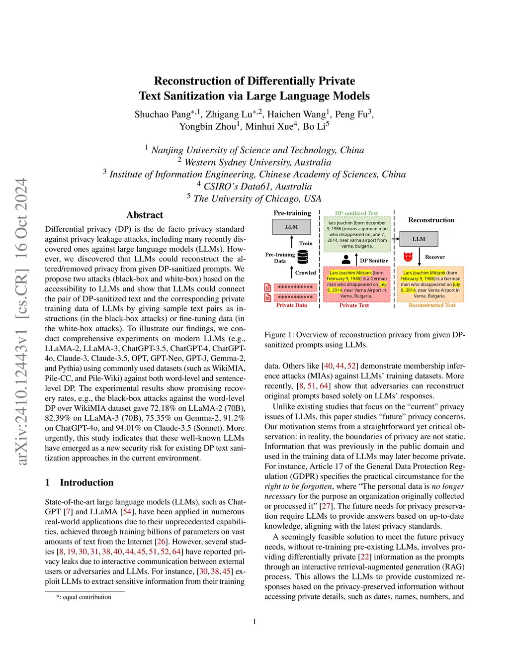 Differential privacy (DP) is the de facto privacy standard against privacy leakage attacks, including many recently discovered ones against large language models (LLMs). However, we discovered that LLMs could reconstruct the altered/removed privacy from given DP-sanitized prompts. We propose two attacks (black-box and white-box) based on the accessibility to LLMs and show that LLMs could connect the pair of DP-sanitized text and the corresponding private training data of LLMs by giving sample text pairs as instructions (in the black-box attacks) or fine-tuning data (in the white-box attacks). To illustrate our findings, we conduct comprehensive experiments on modern LLMs (e.g., LLaMA-2, LLaMA-3, ChatGPT-3.5, ChatGPT-4, ChatGPT-4o, Claude-3, Claude-3.5, OPT, GPT-Neo, GPT-J, Gemma-2, and Pythia) using commonly used datasets (such as WikiMIA, Pile-CC, and Pile-Wiki) against both word-level and sentence-level DP. The experimental results show promising recovery rates, e.g., the black-box attacks against the word-level DP over WikiMIA dataset gave 72.18% on LLaMA-2 (70B), 82.39% on LLaMA-3 (70B), 75.35% on Gemma-2, 91.2% on ChatGPT-4o, and 94.01% on Claude-3.5 (Sonnet). More urgently, this study indicates that these well-known LLMs have emerged as a new security risk for existing DP text sanitization approaches in the current environment.