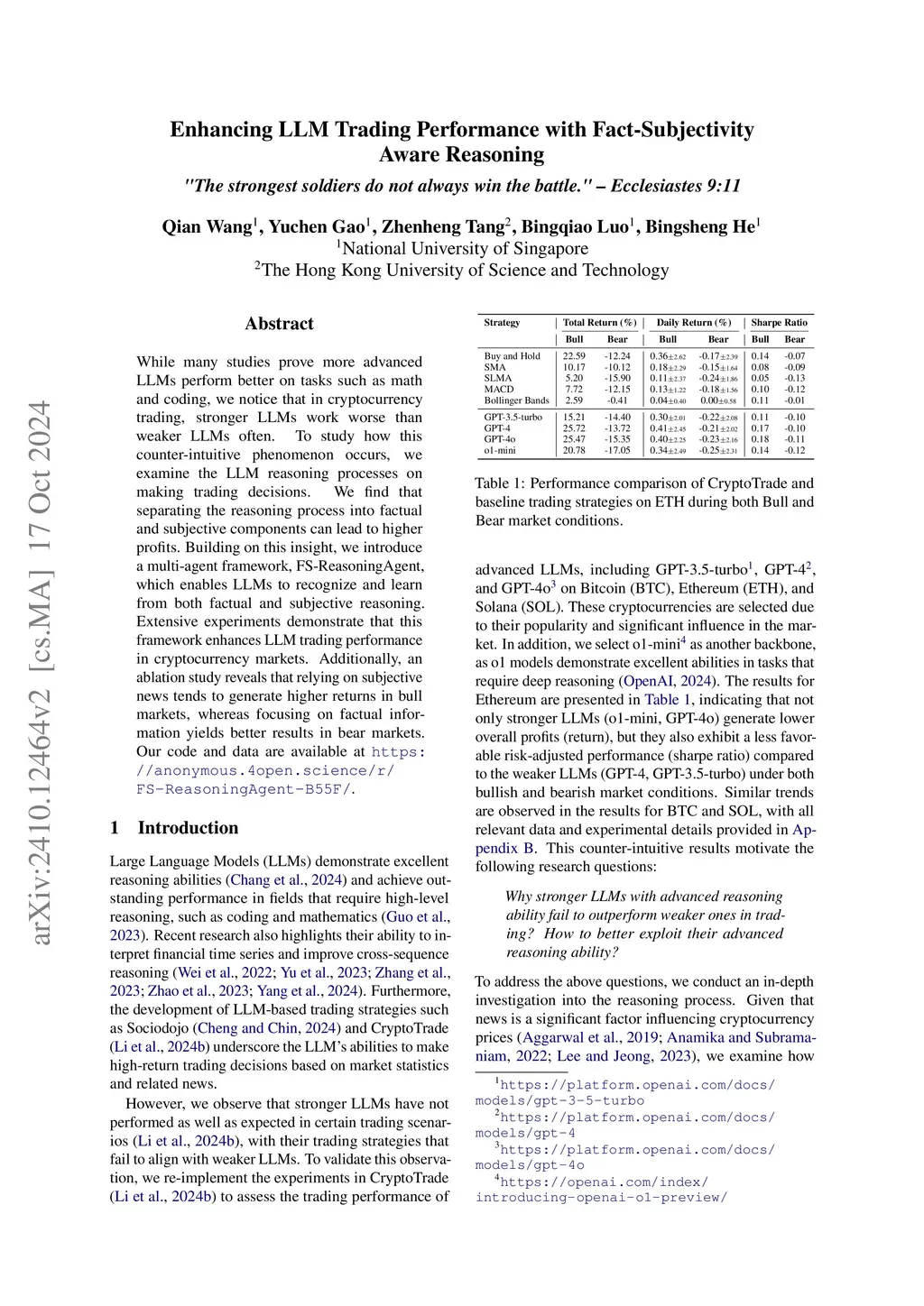 While many studies prove more advanced LLMs perform better on tasks such as math and trading, we notice that in cryptocurrency trading, stronger LLMs work worse than weaker LLMs often. To study how this counter-intuitive phenomenon occurs, we examine the LLM reasoning processes on making trading decisions. We find that separating the reasoning process into factual and subjective components can lead to higher profits. Building on this insight, we introduce a multi-agent framework, FS-ReasoningAgent, which enables LLMs to recognize and learn from both factual and subjective reasoning. Extensive experiments demonstrate that this framework enhances LLM trading performance in cryptocurrency markets. Additionally, an ablation study reveals that relying on subjective news tends to generate higher returns in bull markets, whereas focusing on factual information yields better results in bear markets. Our code and data are available at \url{https://anonymous.4open.science/r/FS-ReasoningAgent-B55F/}.