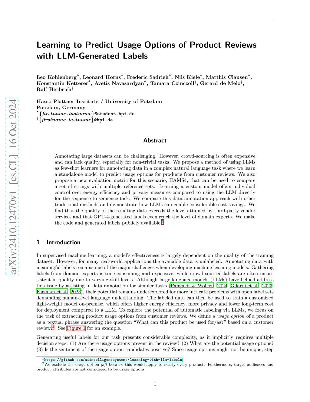 Annotating large datasets can be challenging. However, crowd-sourcing is often expensive and can lack quality, especially for non-trivial tasks. We propose a method of using LLMs as few-shot learners for annotating data in a complex natural language task where we learn a standalone model to predict usage options for products from customer reviews. We also propose a new evaluation metric for this scenario, HAMS4, that can be used to compare a set of strings with multiple reference sets. Learning a custom model offers individual control over energy efficiency and privacy measures compared to using the LLM directly for the sequence-to-sequence task. We compare this data annotation approach with other traditional methods and demonstrate how LLMs can enable considerable cost savings. We find that the quality of the resulting data exceeds the level attained by third-party vendor services and that GPT-4-generated labels even reach the level of domain experts. We make the code and generated labels publicly available.