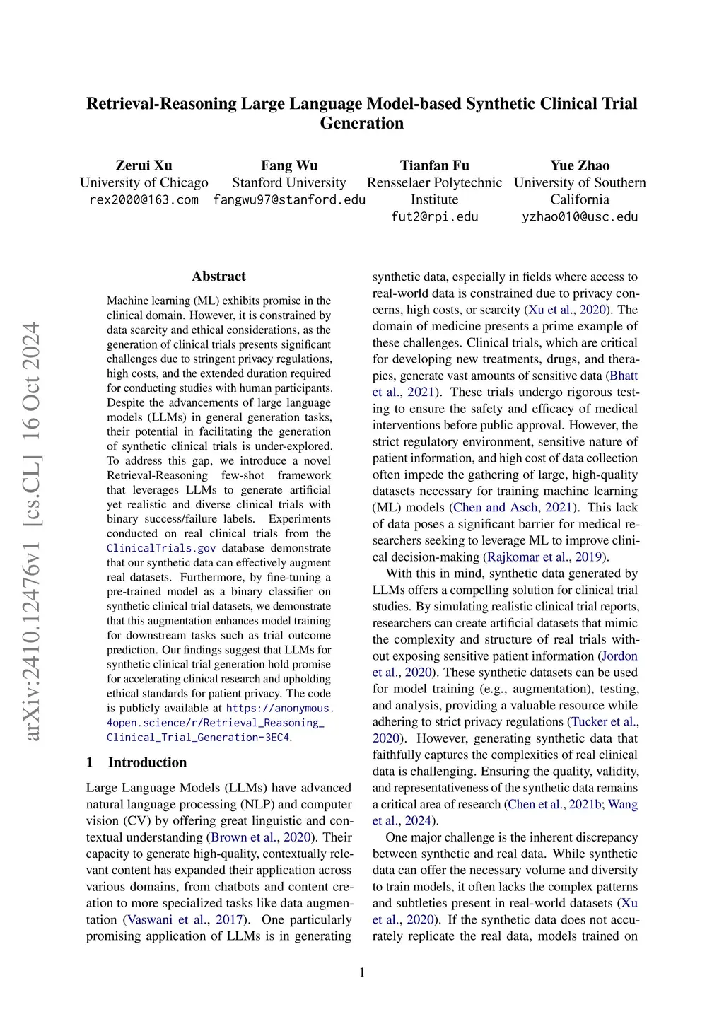 Retrieval-Reasoning Large Language Model-based Synthetic Clinical Trial Generation
