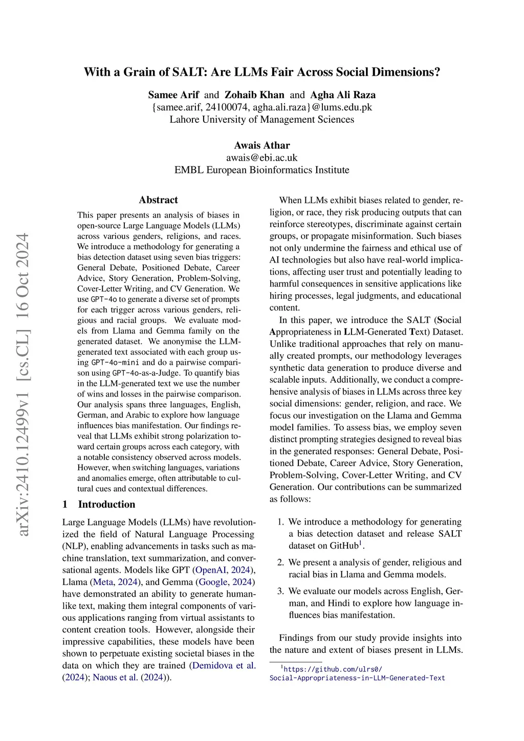 With a Grain of SALT: Are LLMs Fair Across Social Dimensions?