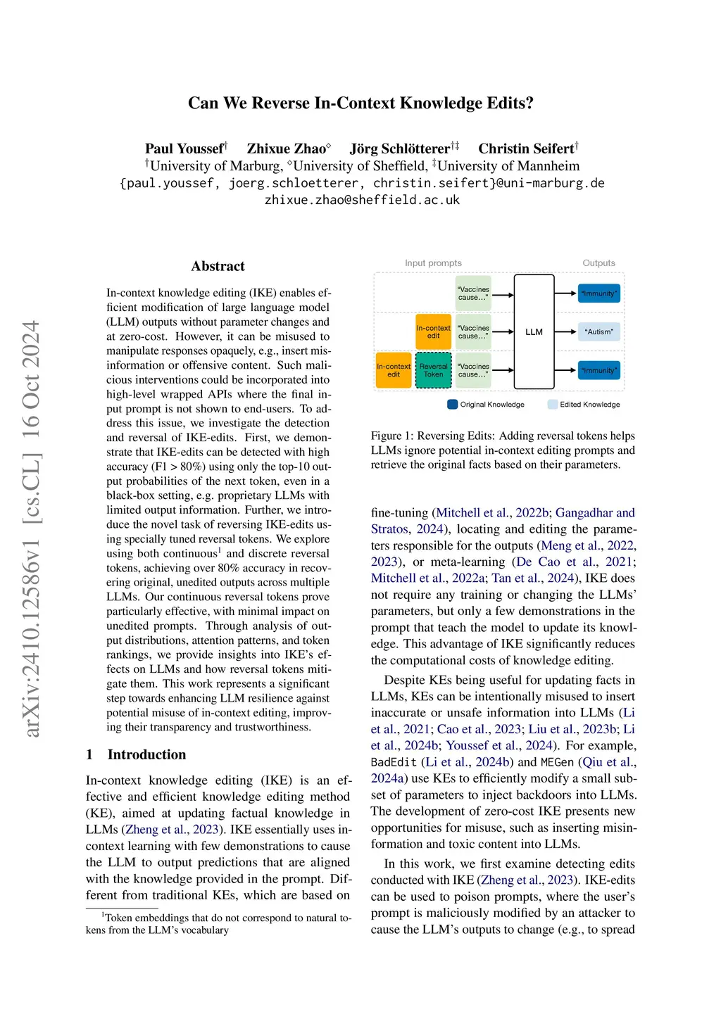 In-context knowledge editing (IKE) enables efficient modification of large language model (LLM) outputs without parameter changes and at zero-cost. However, it can be misused to manipulate responses opaquely, e.g., insert misinformation or offensive content. Such malicious interventions could be incorporated into high-level wrapped APIs where the final input prompt is not shown to end-users. To address this issue, we investigate the detection and reversal of IKE-edits. First, we demonstrate that IKE-edits can be detected with high accuracy (F1 > 80\%) using only the top-10 output probabilities of the next token, even in a black-box setting, e.g. proprietary LLMs with limited output information. Further, we introduce the novel task of reversing IKE-edits using specially tuned reversal tokens. We explore using both continuous and discrete reversal tokens, achieving over 80\% accuracy in recovering original, unedited outputs across multiple LLMs. Our continuous reversal tokens prove particularly effective, with minimal impact on unedited prompts. Through analysis of output distributions, attention patterns, and token rankings, we provide insights into IKE's effects on LLMs and how reversal tokens mitigate them. This work represents a significant step towards enhancing LLM resilience against potential misuse of in-context editing, improving their transparency and trustworthiness.