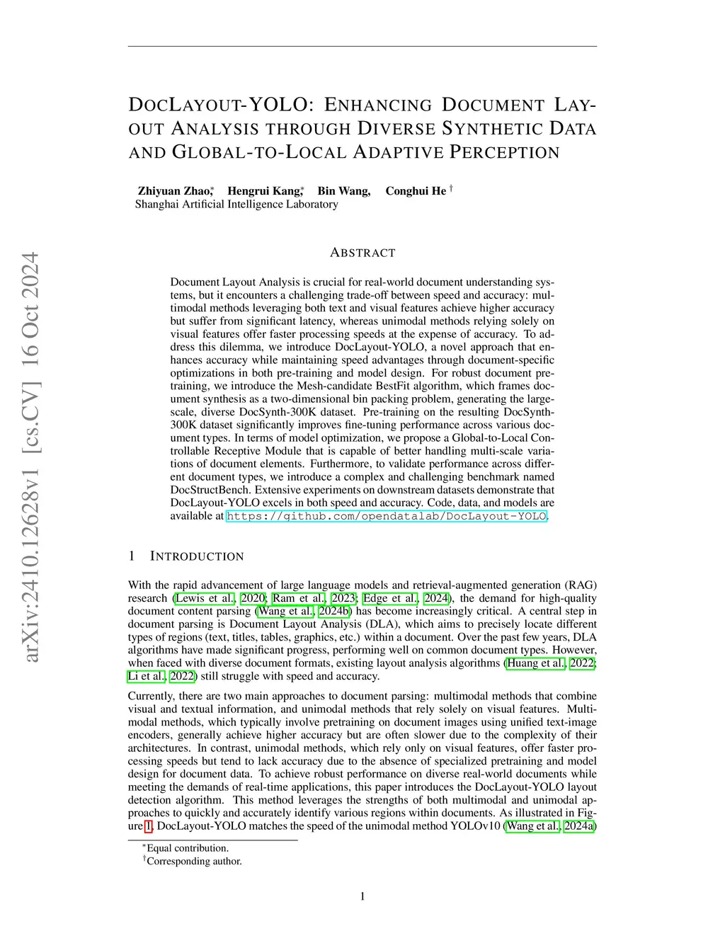 Document Layout Analysis is crucial for real-world document understanding systems, but it encounters a challenging trade-off between speed and accuracy: multimodal methods leveraging both text and visual features achieve higher accuracy but suffer from significant latency, whereas unimodal methods relying solely on visual features offer faster processing speeds at the expense of accuracy. To address this dilemma, we introduce DocLayout-YOLO, a novel approach that enhances accuracy while maintaining speed advantages through document-specific optimizations in both pre-training and model design. For robust document pre-training, we introduce the Mesh-candidate BestFit algorithm, which frames document synthesis as a two-dimensional bin packing problem, generating the large-scale, diverse DocSynth-300K dataset. Pre-training on the resulting DocSynth-300K dataset significantly improves fine-tuning performance across various document types. In terms of model optimization, we propose a Global-to-Local Controllable Receptive Module that is capable of better handling multi-scale variations of document elements. Furthermore, to validate performance across different document types, we introduce a complex and challenging benchmark named DocStructBench. Extensive experiments on downstream datasets demonstrate that DocLayout-YOLO excels in both speed and accuracy. Code, data, and models are available at https://github.com/opendatalab/DocLayout-YOLO.