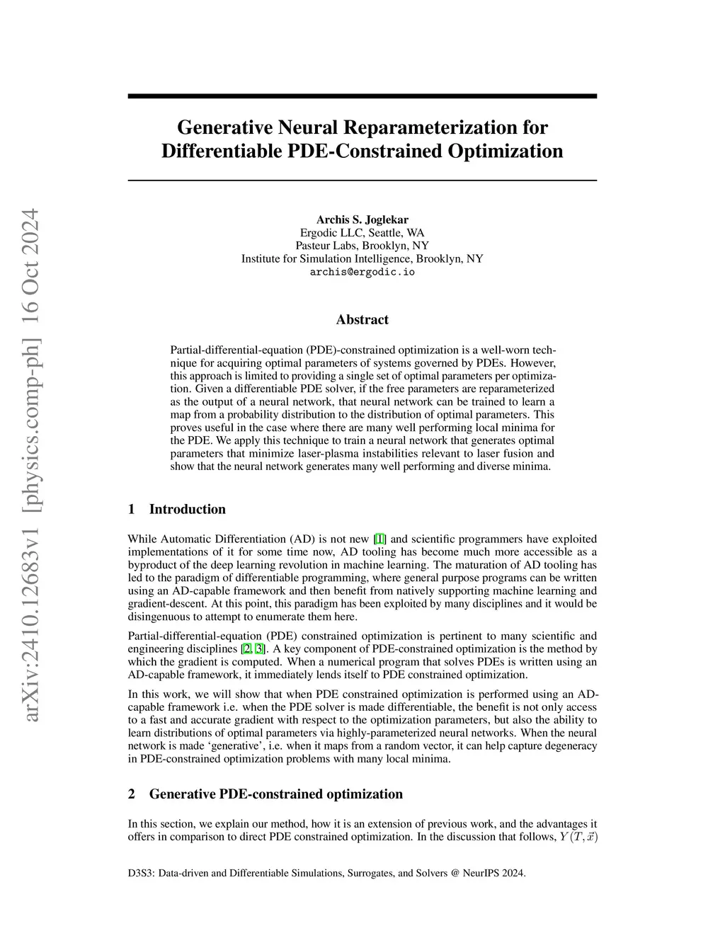 Partial-differential-equation (PDE)-constrained optimization is a well-worn technique for acquiring optimal parameters of systems governed by PDEs. However, this approach is limited to providing a single set of optimal parameters per optimization. Given a differentiable PDE solver, if the free parameters are reparameterized as the output of a neural network, that neural network can be trained to learn a map from a probability distribution to the distribution of optimal parameters. This proves useful in the case where there are many well performing local minima for the PDE. We apply this technique to train a neural network that generates optimal parameters that minimize laser-plasma instabilities relevant to laser fusion and show that the neural network generates many well performing and diverse minima.