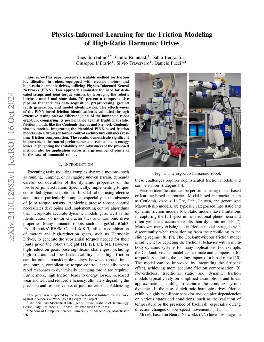 This paper presents a scalable method for friction identification in robots equipped with electric motors and high-ratio harmonic drives, utilizing Physics-Informed Neural Networks (PINN). This approach eliminates the need for dedicated setups and joint torque sensors by leveraging the robo\v{t}s intrinsic model and state data. We present a comprehensive pipeline that includes data acquisition, preprocessing, ground truth generation, and model identification. The effectiveness of the PINN-based friction identification is validated through extensive testing on two different joints of the humanoid robot ergoCub, comparing its performance against traditional static friction models like the Coulomb-viscous and Stribeck-Coulomb-viscous models. Integrating the identified PINN-based friction models into a two-layer torque control architecture enhances real-time friction compensation. The results demonstrate significant improvements in control performance and reductions in energy losses, highlighting the scalability and robustness of the proposed method, also for application across a large number of joints as in the case of humanoid robots.