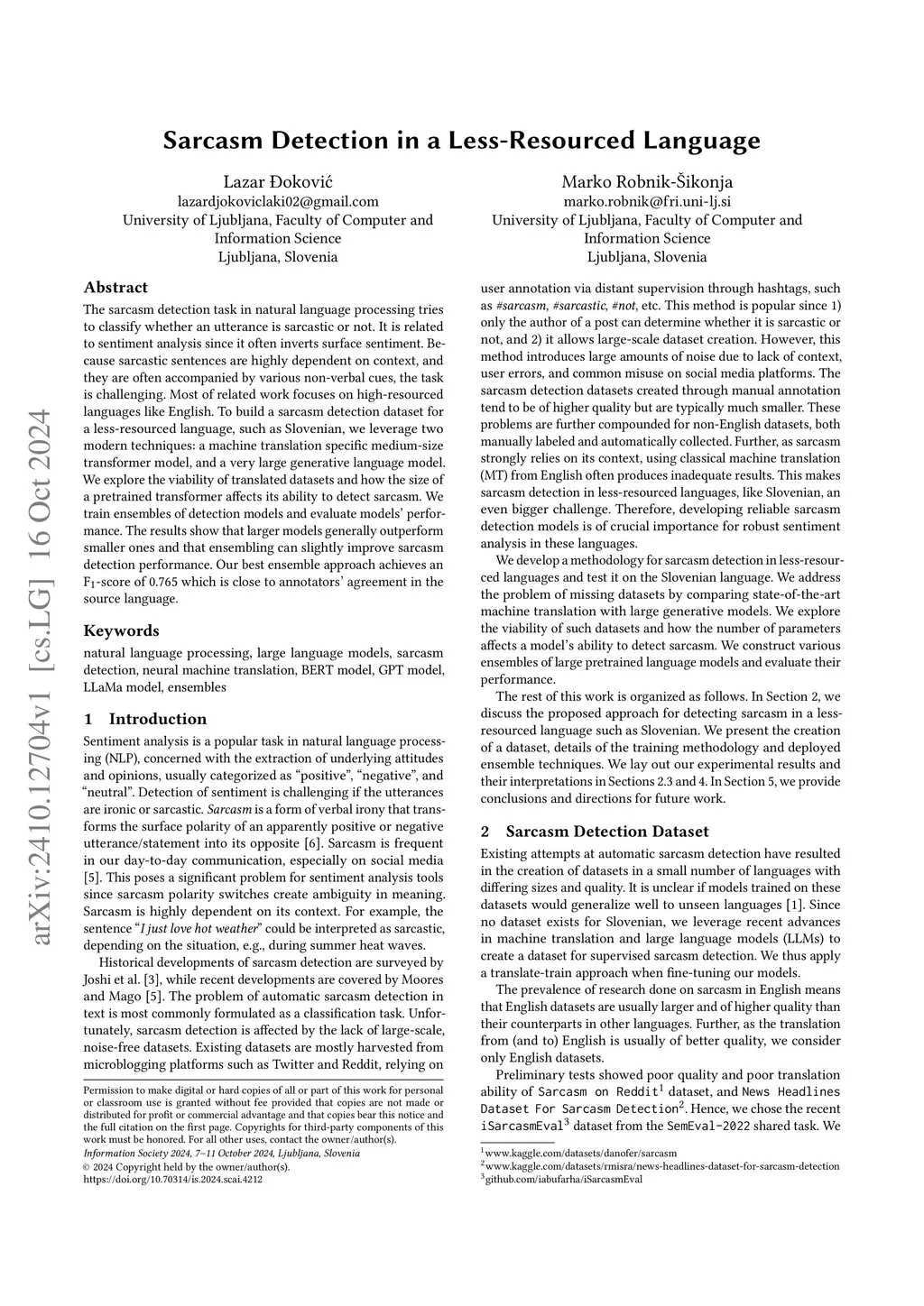 The sarcasm detection task in natural language processing tries to classify whether an utterance is sarcastic or not. It is related to sentiment analysis since it often inverts surface sentiment. Because sarcastic sentences are highly dependent on context, and they are often accompanied by various non-verbal cues, the task is challenging. Most of related work focuses on high-resourced languages like English. To build a sarcasm detection dataset for a less-resourced language, such as Slovenian, we leverage two modern techniques: a machine translation specific medium-size transformer model, and a very large generative language model. We explore the viability of translated datasets and how the size of a pretrained transformer affects its ability to detect sarcasm. We train ensembles of detection models and evaluate models' performance. The results show that larger models generally outperform smaller ones and that ensembling can slightly improve sarcasm detection performance. Our best ensemble approach achieves an -score of 0.765 which is close to annotators' agreement in the source language.