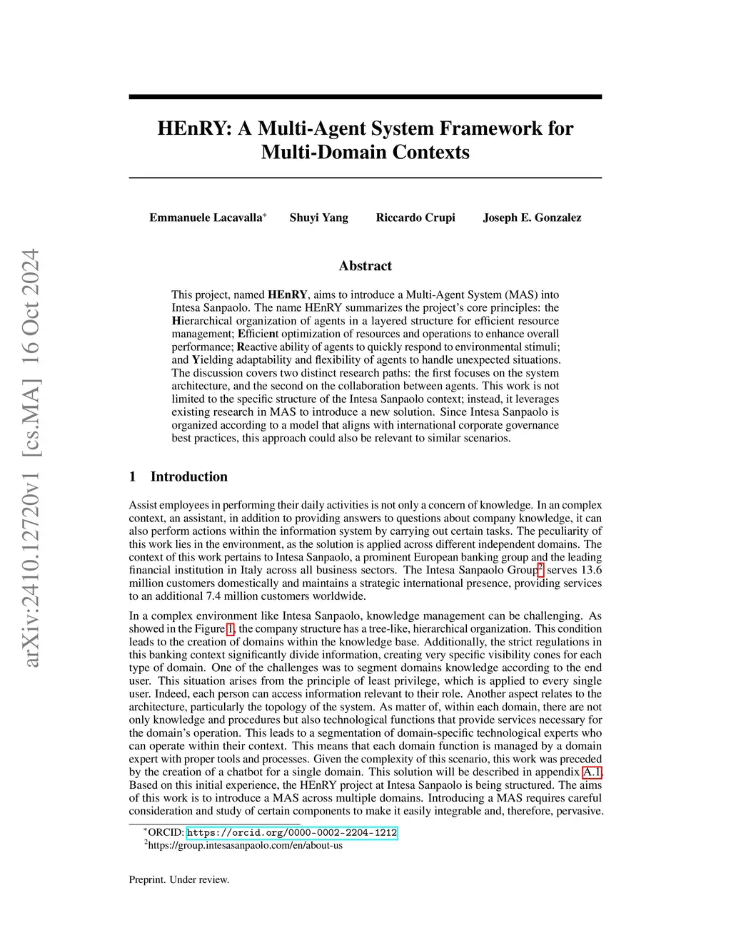 This project, named HEnRY, aims to introduce a Multi-Agent System (MAS) into Intesa Sanpaolo. The name HEnRY summarizes the project's core principles: the Hierarchical organization of agents in a layered structure for efficient resource management; Efficient optimization of resources and operations to enhance overall performance; Reactive ability of agents to quickly respond to environmental stimuli; and Yielding adaptability and flexibility of agents to handle unexpected situations. The discussion covers two distinct research paths: the first focuses on the system architecture, and the second on the collaboration between agents. This work is not limited to the specific structure of the Intesa Sanpaolo context; instead, it leverages existing research in MAS to introduce a new solution. Since Intesa Sanpaolo is organized according to a model that aligns with international corporate governance best practices, this approach could also be relevant to similar scenarios.