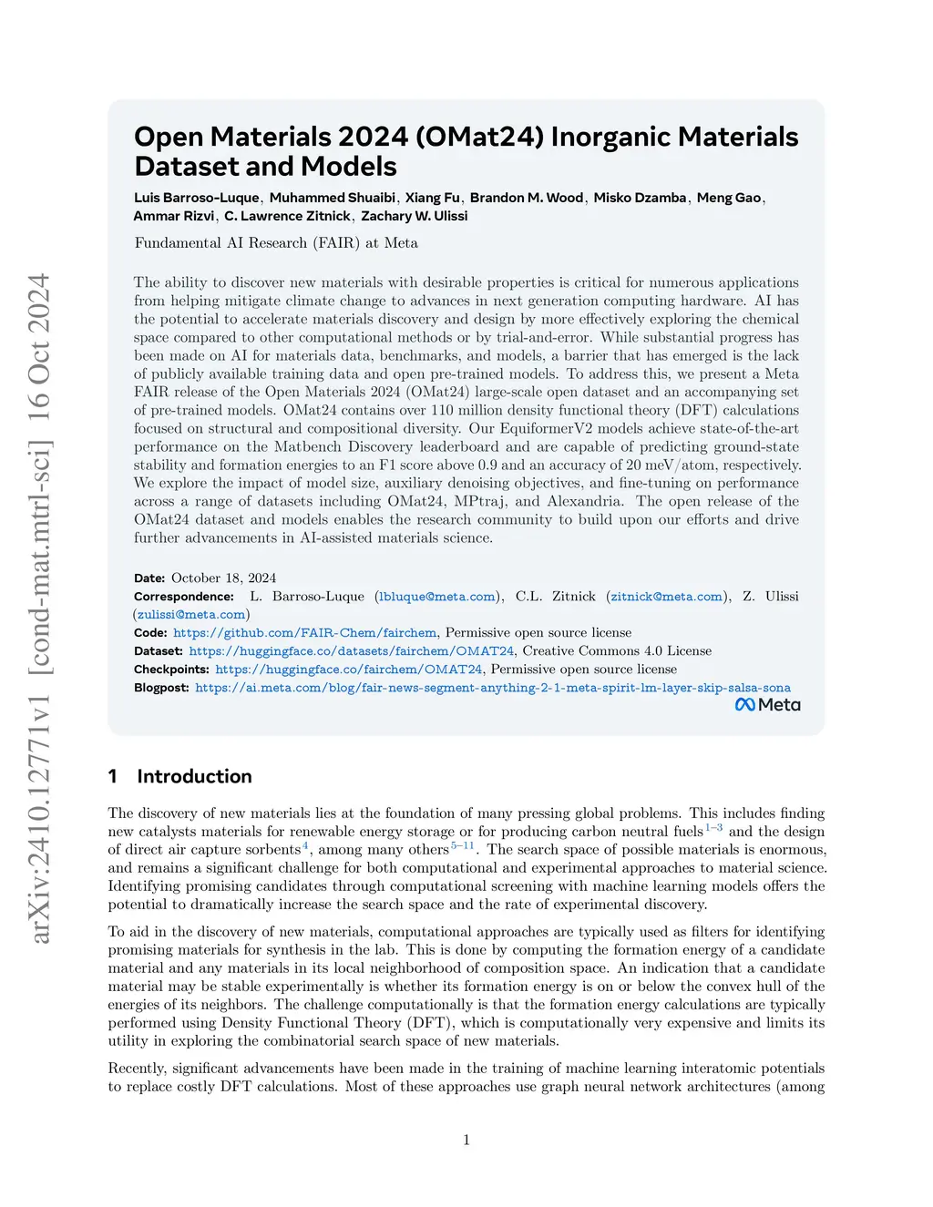 The ability to discover new materials with desirable properties is critical for numerous applications from helping mitigate climate change to advances in next generation computing hardware. AI has the potential to accelerate materials discovery and design by more effectively exploring the chemical space compared to other computational methods or by trial-and-error. While substantial progress has been made on AI for materials data, benchmarks, and models, a barrier that has emerged is the lack of publicly available training data and open pre-trained models. To address this, we present a Meta FAIR release of the Open Materials 2024 (OMat24) large-scale open dataset and an accompanying set of pre-trained models. OMat24 contains over 110 million density functional theory (DFT) calculations focused on structural and compositional diversity. Our EquiformerV2 models achieve state-of-the-art performance on the Matbench Discovery leaderboard and are capable of predicting ground-state stability and formation energies to an F1 score above 0.9 and an accuracy of 20 meV/atom, respectively. We explore the impact of model size, auxiliary denoising objectives, and fine-tuning on performance across a range of datasets including OMat24, MPtraj, and Alexandria. The open release of the OMat24 dataset and models enables the research community to build upon our efforts and drive further advancements in AI-assisted materials science.