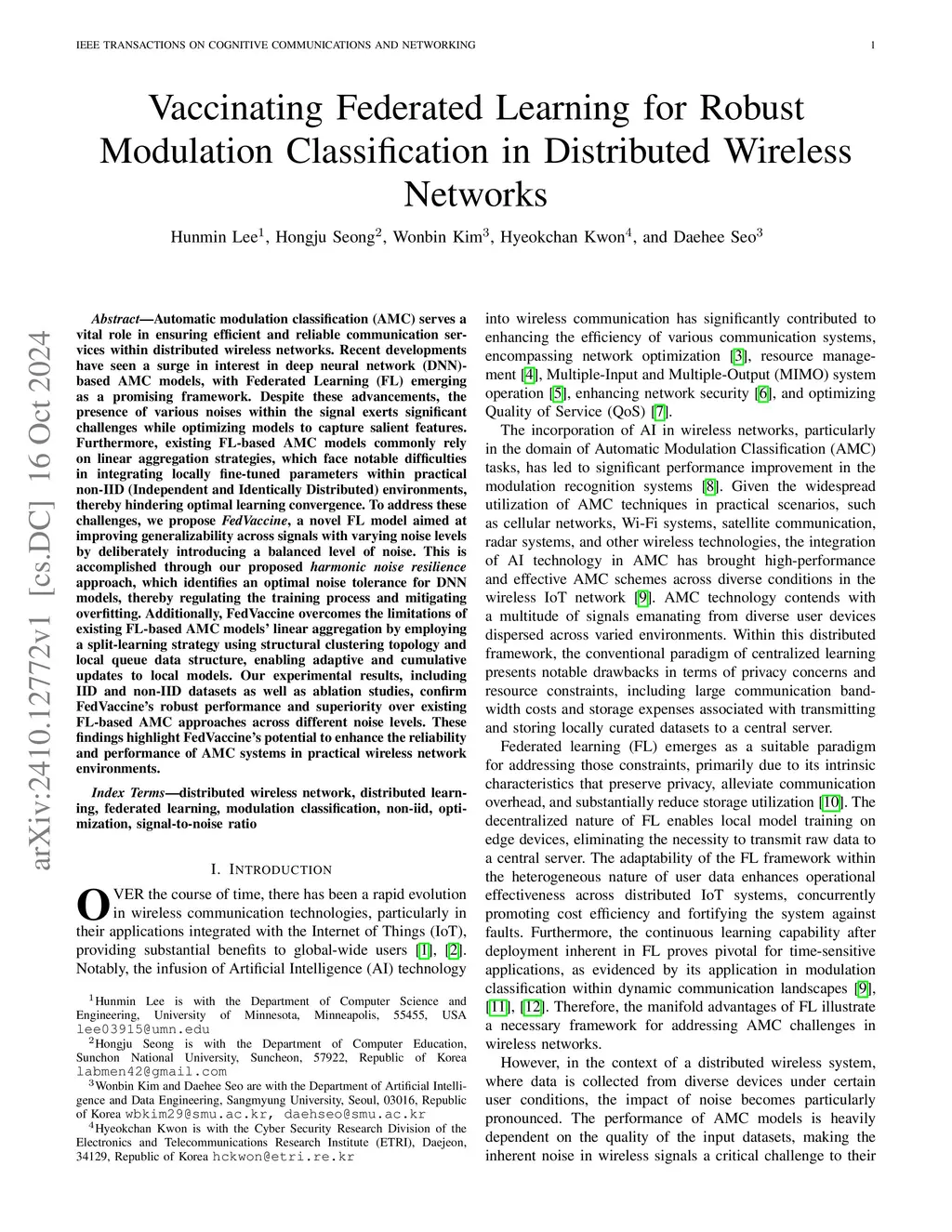 Automatic modulation classification (AMC) serves a vital role in ensuring efficient and reliable communication services within distributed wireless networks. Recent developments have seen a surge in interest in deep neural network (DNN)-based AMC models, with Federated Learning (FL) emerging as a promising framework. Despite these advancements, the presence of various noises within the signal exerts significant challenges while optimizing models to capture salient features. Furthermore, existing FL-based AMC models commonly rely on linear aggregation strategies, which face notable difficulties in integrating locally fine-tuned parameters within practical non-IID (Independent and Identically Distributed) environments, thereby hindering optimal learning convergence. To address these challenges, we propose FedVaccine, a novel FL model aimed at improving generalizability across signals with varying noise levels by deliberately introducing a balanced level of noise. This is accomplished through our proposed harmonic noise resilience approach, which identifies an optimal noise tolerance for DNN models, thereby regulating the training process and mitigating overfitting. Additionally, FedVaccine overcomes the limitations of existing FL-based AMC models' linear aggregation by employing a split-learning strategy using structural clustering topology and local queue data structure, enabling adaptive and cumulative updates to local models. Our experimental results, including IID and non-IID datasets as well as ablation studies, confirm FedVaccine's robust performance and superiority over existing FL-based AMC approaches across different noise levels. These findings highlight FedVaccine's potential to enhance the reliability and performance of AMC systems in practical wireless network environments.