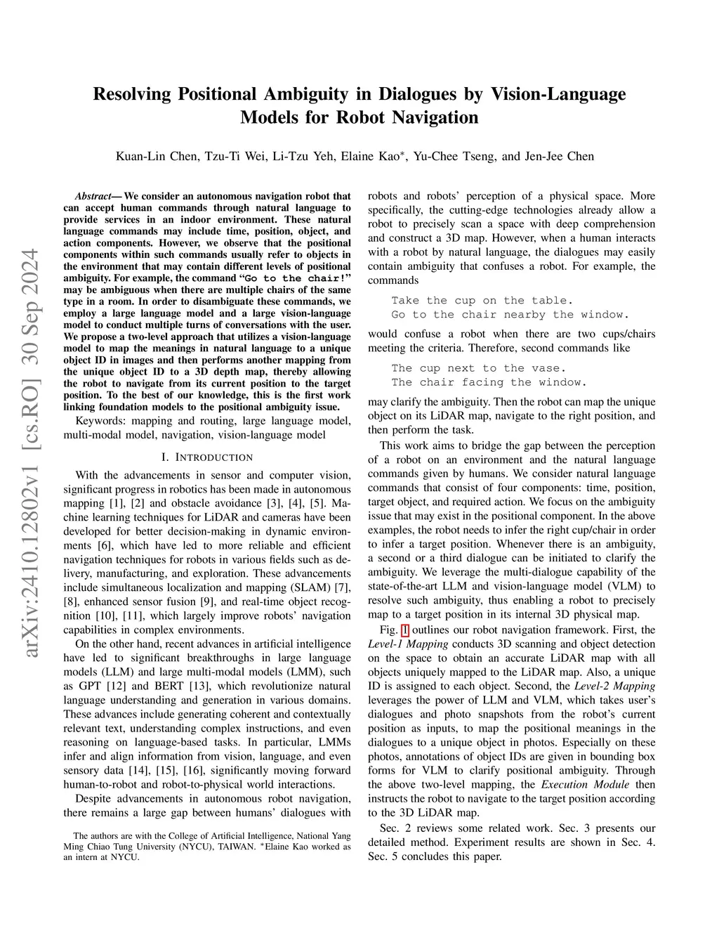We consider an autonomous navigation robot that can accept human commands through natural language to provide services in an indoor environment. These natural language commands may include time, position, object, and action components. However, we observe that the positional components within such commands usually refer to objects in the environment that may contain different levels of positional ambiguity. For example, the command "Go to the chair!" may be ambiguous when there are multiple chairs of the same type in a room. In order to disambiguate these commands, we employ a large language model and a large vision-language model to conduct multiple turns of conversations with the user. We propose a two-level approach that utilizes a vision-language model to map the meanings in natural language to a unique object ID in images and then performs another mapping from the unique object ID to a 3D depth map, thereby allowing the robot to navigate from its current position to the target position. To the best of our knowledge, this is the first work linking foundation models to the positional ambiguity issue.