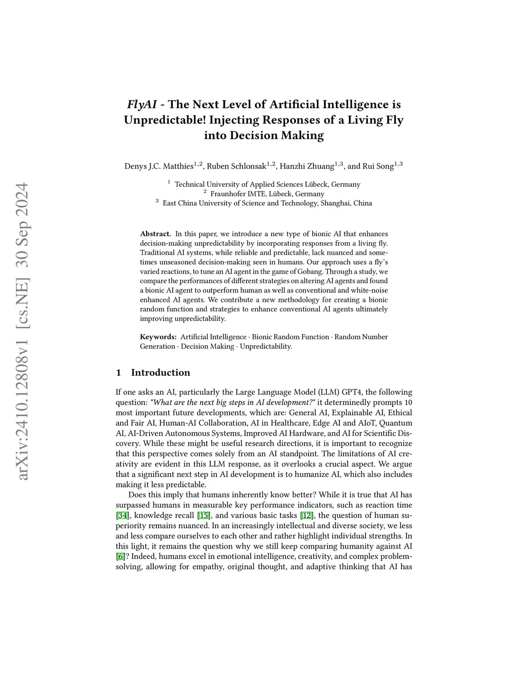 In this paper, we introduce a new type of bionic AI that enhances decision-making unpredictability by incorporating responses from a living fly. Traditional AI systems, while reliable and predictable, lack nuanced and sometimes unseasoned decision-making seen in humans. Our approach uses a fly's varied reactions, to tune an AI agent in the game of Gobang. Through a study, we compare the performances of different strategies on altering AI agents and found a bionic AI agent to outperform human as well as conventional and white-noise enhanced AI agents. We contribute a new methodology for creating a bionic random function and strategies to enhance conventional AI agents ultimately improving unpredictability.