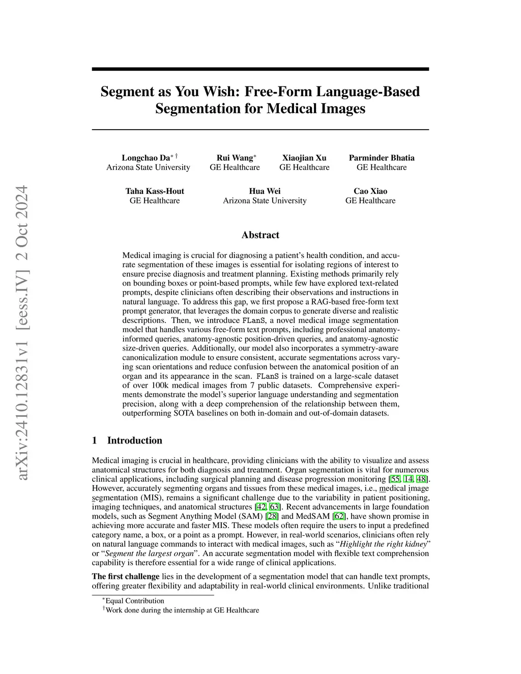 Medical imaging is crucial for diagnosing a patient's health condition, and accurate segmentation of these images is essential for isolating regions of interest to ensure precise diagnosis and treatment planning. Existing methods primarily rely on bounding boxes or point-based prompts, while few have explored text-related prompts, despite clinicians often describing their observations and instructions in natural language. To address this gap, we first propose a RAG-based free-form text prompt generator, that leverages the domain corpus to generate diverse and realistic descriptions. Then, we introduce FLanS, a novel medical image segmentation model that handles various free-form text prompts, including professional anatomy-informed queries, anatomy-agnostic position-driven queries, and anatomy-agnostic size-driven queries. Additionally, our model also incorporates a symmetry-aware canonicalization module to ensure consistent, accurate segmentations across varying scan orientations and reduce confusion between the anatomical position of an organ and its appearance in the scan. FLanS is trained on a large-scale dataset of over 100k medical images from 7 public datasets. Comprehensive experiments demonstrate the model's superior language understanding and segmentation precision, along with a deep comprehension of the relationship between them, outperforming SOTA baselines on both in-domain and out-of-domain datasets.