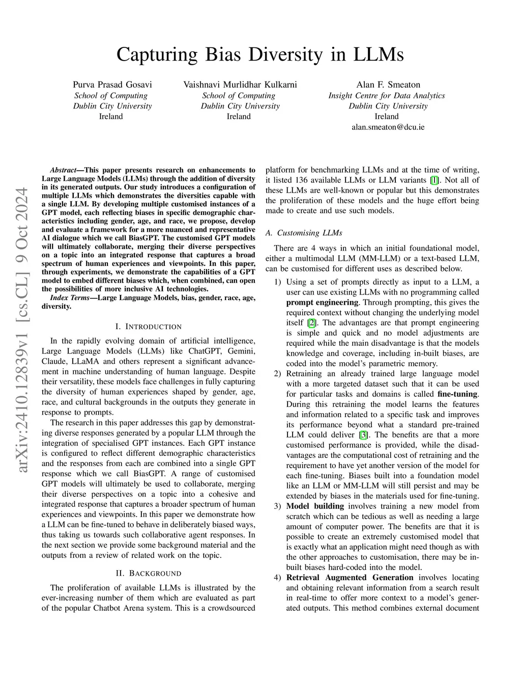 This paper presents research on enhancements to Large Language Models (LLMs) through the addition of diversity in its generated outputs. Our study introduces a configuration of multiple LLMs which demonstrates the diversities capable with a single LLM. By developing multiple customised instances of a GPT model, each reflecting biases in specific demographic characteristics including gender, age, and race, we propose, develop and evaluate a framework for a more nuanced and representative AI dialogue which we call BiasGPT. The customised GPT models will ultimately collaborate, merging their diverse perspectives on a topic into an integrated response that captures a broad spectrum of human experiences and viewpoints. In this paper, through experiments, we demonstrate the capabilities of a GPT model to embed different biases which, when combined, can open the possibilities of more inclusive AI technologies.