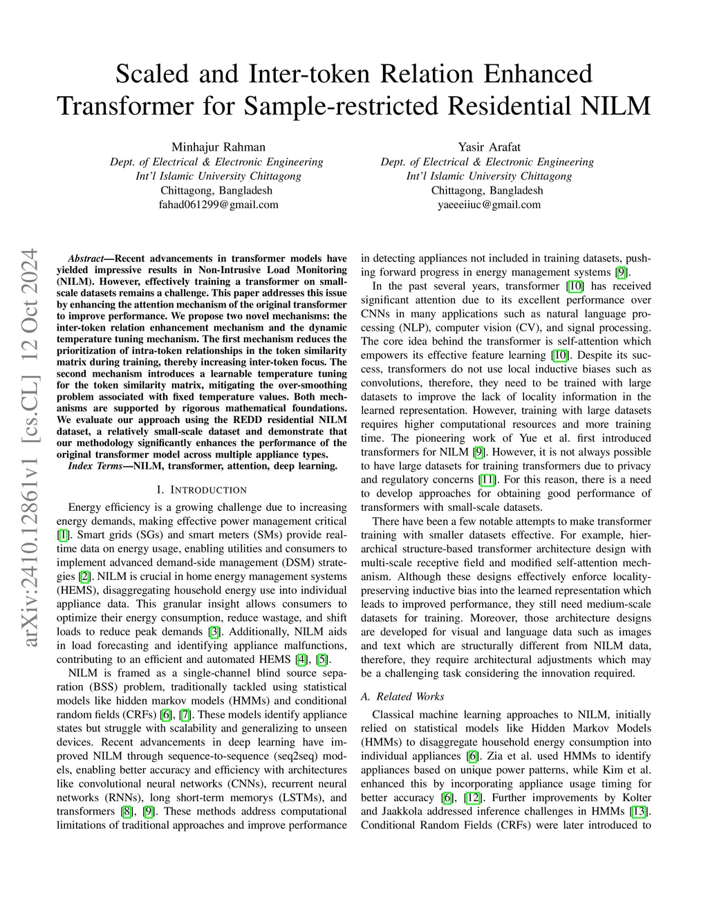 Recent advancements in transformer models have yielded impressive results in Non-Intrusive Load Monitoring (NILM). However, effectively training a transformer on small-scale datasets remains a challenge. This paper addresses this issue by enhancing the attention mechanism of the original transformer to improve performance. We propose two novel mechanisms: the inter-token relation enhancement mechanism and the dynamic temperature tuning mechanism. The first mechanism reduces the prioritization of intra-token relationships in the token similarity matrix during training, thereby increasing inter-token focus. The second mechanism introduces a learnable temperature tuning for the token similarity matrix, mitigating the over-smoothing problem associated with fixed temperature values. Both mechanisms are supported by rigorous mathematical foundations. We evaluate our approach using the REDD residential NILM dataset, a relatively small-scale dataset and demonstrate that our methodology significantly enhances the performance of the original transformer model across multiple appliance types.