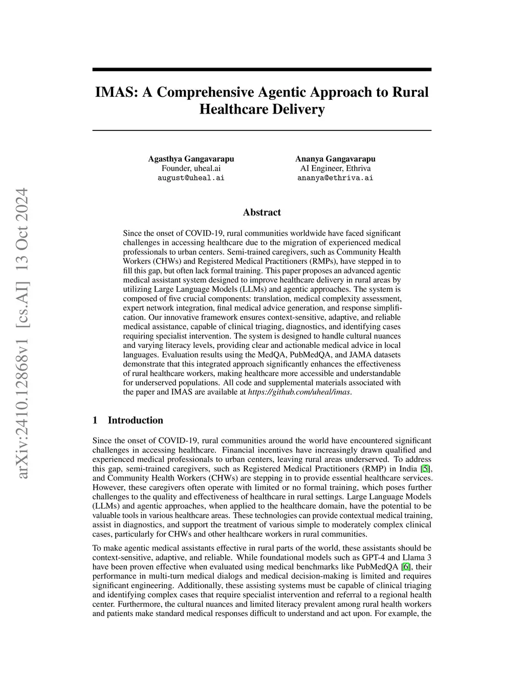 Since the onset of COVID-19, rural communities worldwide have faced significant challenges in accessing healthcare due to the migration of experienced medical professionals to urban centers. Semi-trained caregivers, such as Community Health Workers (CHWs) and Registered Medical Practitioners (RMPs), have stepped in to fill this gap, but often lack formal training. This paper proposes an advanced agentic medical assistant system designed to improve healthcare delivery in rural areas by utilizing Large Language Models (LLMs) and agentic approaches. The system is composed of five crucial components: translation, medical complexity assessment, expert network integration, final medical advice generation, and response simplification. Our innovative framework ensures context-sensitive, adaptive, and reliable medical assistance, capable of clinical triaging, diagnostics, and identifying cases requiring specialist intervention. The system is designed to handle cultural nuances and varying literacy levels, providing clear and actionable medical advice in local languages. Evaluation results using the MedQA, PubMedQA, and JAMA datasets demonstrate that this integrated approach significantly enhances the effectiveness of rural healthcare workers, making healthcare more accessible and understandable for underserved populations. All code and supplemental materials associated with the paper and IMAS are available at https://github.com/uheal/imas.
