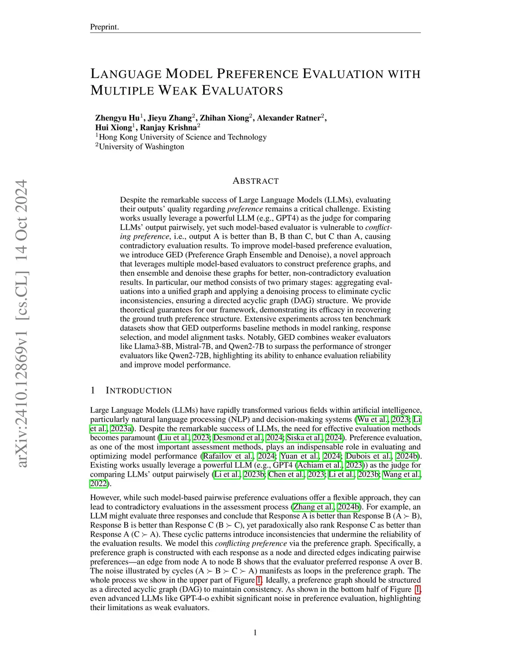 Despite the remarkable success of Large Language Models (LLMs), evaluating their outputs' quality regarding preference remains a critical challenge. While existing works usually leverage a strong LLM as the judge for comparing LLMs' response pairwisely, such a single-evaluator approach is vulnerable to cyclic preference, i.e., output A is better than B, B than C, but C is better than A, causing contradictory evaluation results. To address this, we introduce PGED (Preference Graph Ensemble and Denoising), a novel approach that leverages multiple model-based evaluators to construct preference graphs, and then ensembles and denoises these graphs for acyclic, non-contradictory evaluation results. We provide theoretical guarantees for our framework, demonstrating its efficacy in recovering the ground truth preference structure. Extensive experiments on ten benchmarks demonstrate PGED's superiority in three applications: 1) model ranking for evaluation, 2) response selection for test-time scaling, and 3) data selection for model fine-tuning. Notably, PGED combines small LLM evaluators (e.g., Llama3-8B, Mistral-7B, Qwen2-7B) to outperform strong ones (e.g., Qwen2-72B), showcasing its effectiveness in enhancing evaluation reliability and improving model performance.