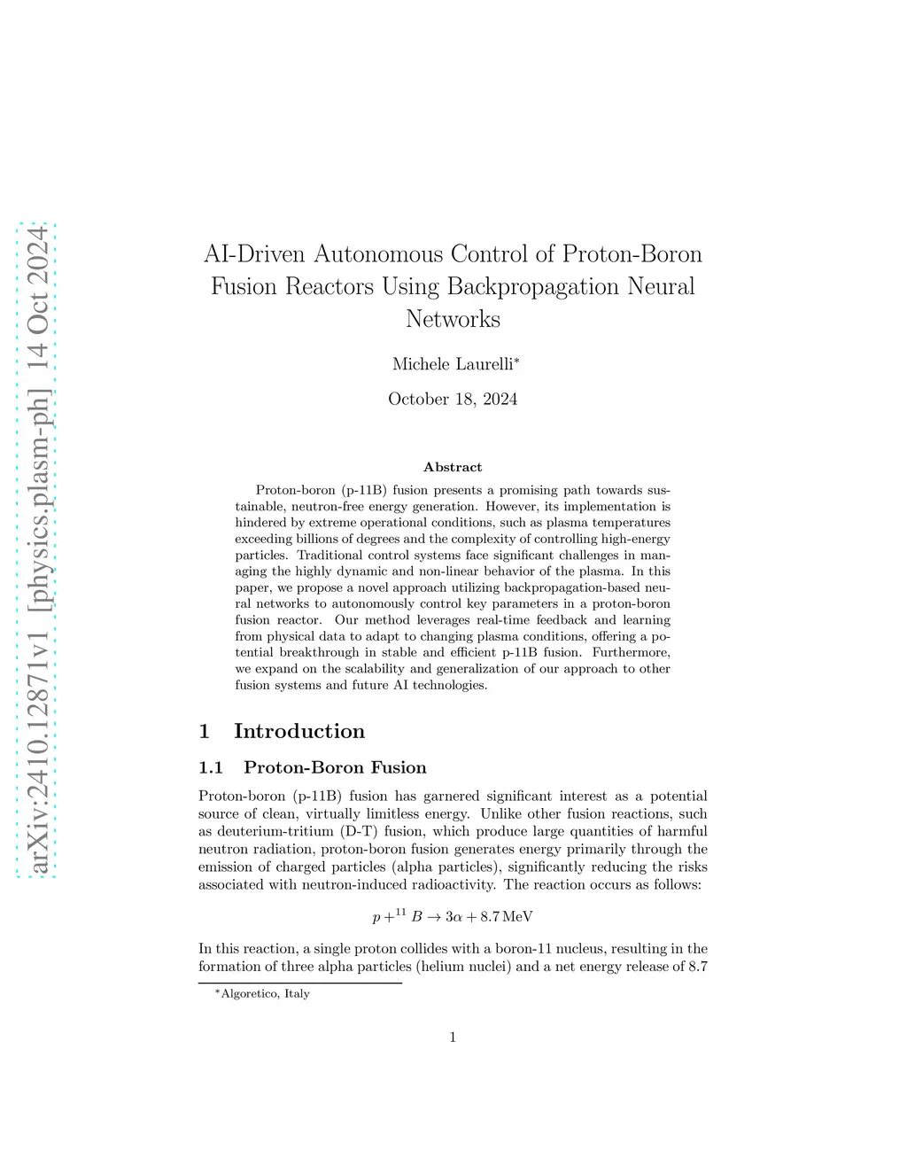 Proton-boron (p-11B) fusion presents a promising path towards sustainable, neutron-free energy generation. However, its implementation is hindered by extreme operational conditions, such as plasma temperatures exceeding billions of degrees and the complexity of controlling high-energy particles. Traditional control systems face significant challenges in managing the highly dynamic and non-linear behavior of the plasma. In this paper, we propose a novel approach utilizing backpropagation-based neural networks to autonomously control key parameters in a proton-boron fusion reactor. Our method leverages real-time feedback and learning from physical data to adapt to changing plasma conditions, offering a potential breakthrough in stable and efficient p-11B fusion. Furthermore, we expand on the scalability and generalization of our approach to other fusion systems and future AI technologies.