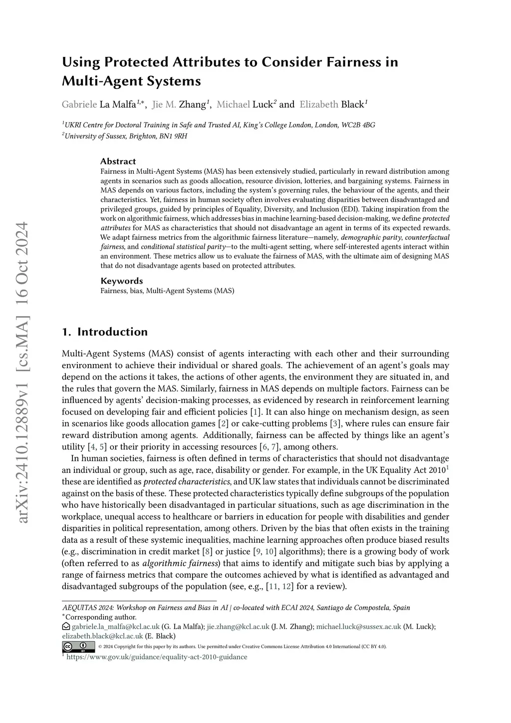 Fairness in Multi-Agent Systems (MAS) has been extensively studied, particularly in reward distribution among agents in scenarios such as goods allocation, resource division, lotteries, and bargaining systems. Fairness in MAS depends on various factors, including the system's governing rules, the behaviour of the agents, and their characteristics. Yet, fairness in human society often involves evaluating disparities between disadvantaged and privileged groups, guided by principles of Equality, Diversity, and Inclusion (EDI). Taking inspiration from the work on algorithmic fairness, which addresses bias in machine learning-based decision-making, we define protected attributes for MAS as characteristics that should not disadvantage an agent in terms of its expected rewards. We adapt fairness metrics from the algorithmic fairness literature -- namely, demographic parity, counterfactual fairness, and conditional statistical parity -- to the multi-agent setting, where self-interested agents interact within an environment. These metrics allow us to evaluate the fairness of MAS, with the ultimate aim of designing MAS that do not disadvantage agents based on protected attributes.