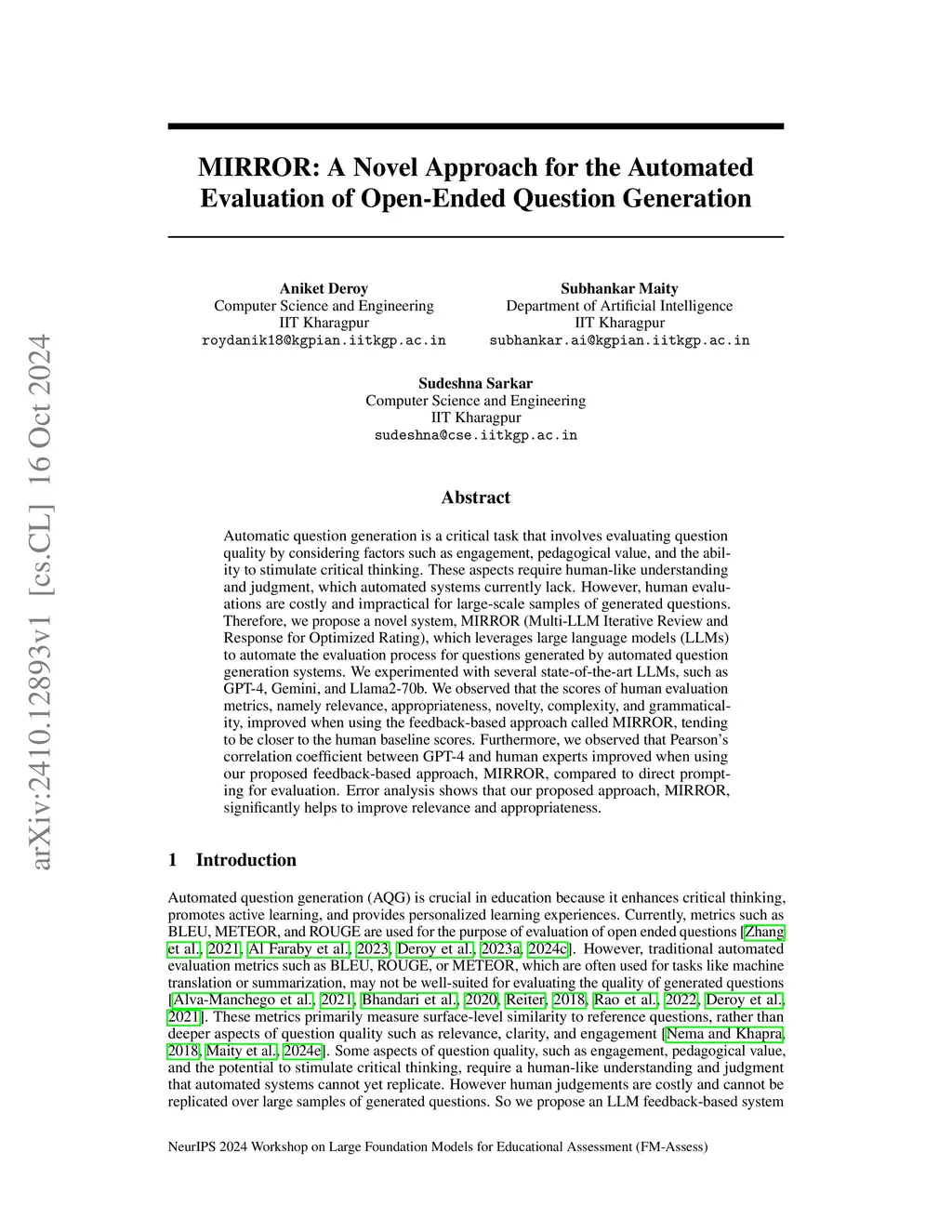 MIRROR: A Novel Approach for the Automated Evaluation of Open-Ended Question Generation