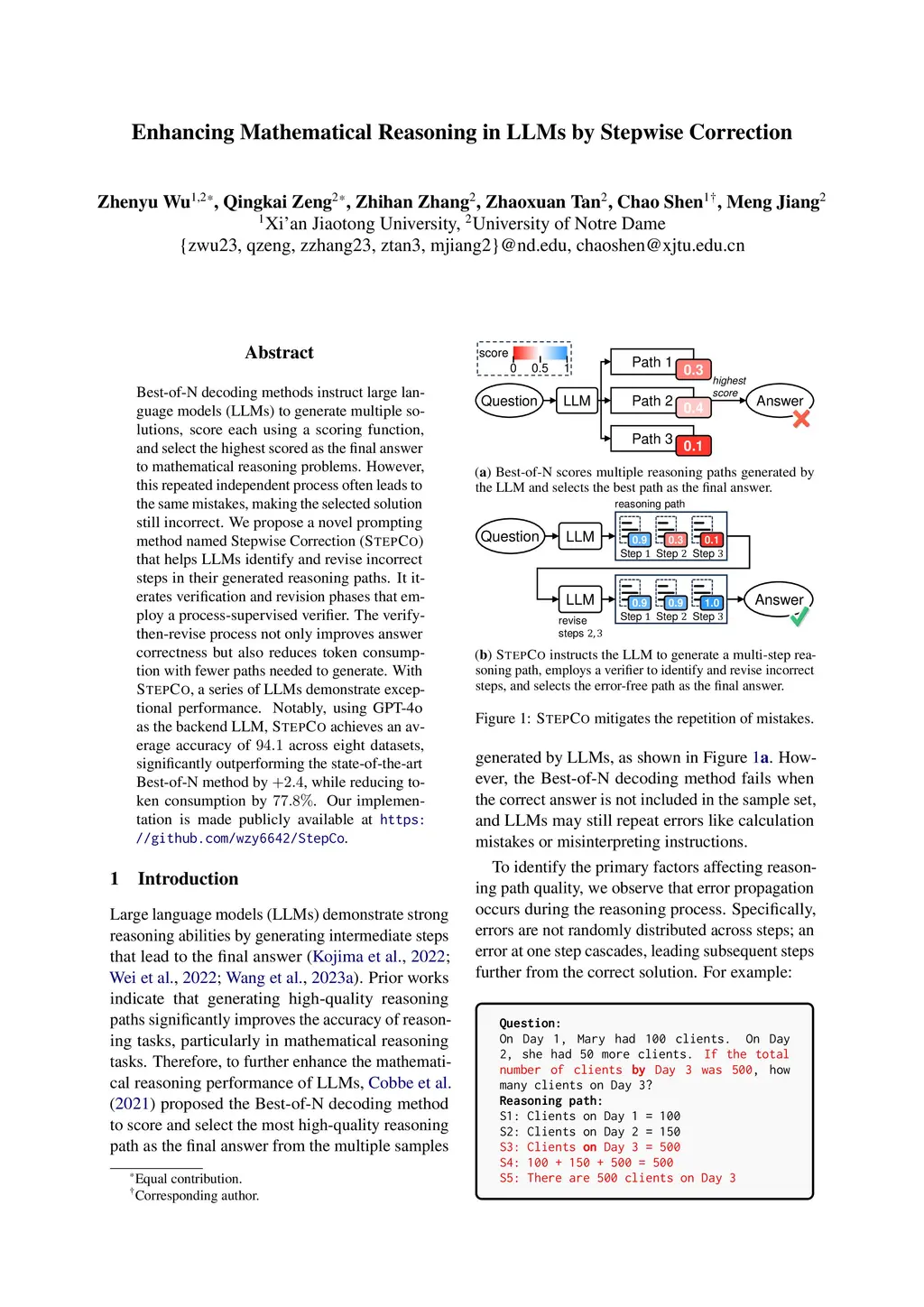 Best-of-N decoding methods instruct large language models (LLMs) to generate multiple solutions, score each using a scoring function, and select the highest scored as the final answer to mathematical reasoning problems. However, this repeated independent process often leads to the same mistakes, making the selected solution still incorrect. We propose a novel prompting method named Stepwise Correction (StepCo) that helps LLMs identify and revise incorrect steps in their generated reasoning paths. It iterates verification and revision phases that employ a process-supervised verifier. The verify-then-revise process not only improves answer correctness but also reduces token consumption with fewer paths needed to generate. With StepCo, a series of LLMs demonstrate exceptional performance. Notably, using GPT-4o as the backend LLM, StepCo achieves an average accuracy of 94.1 across eight datasets, significantly outperforming the state-of-the-art Best-of-N method by +2.4, while reducing token consumption by 77.8%.