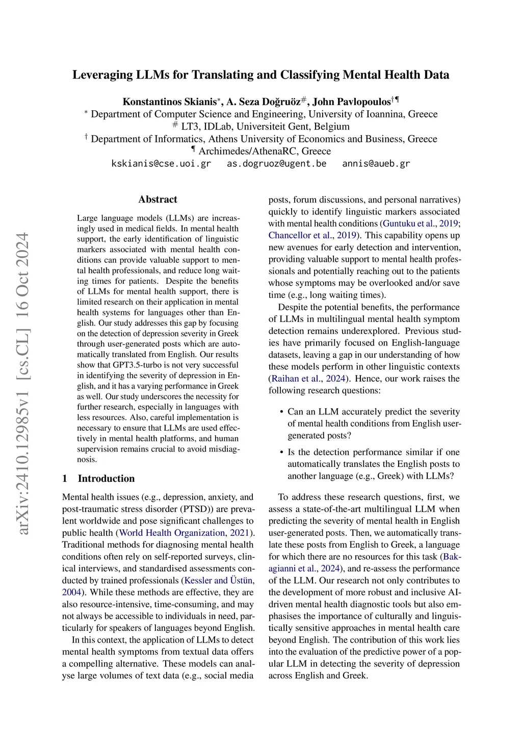 Large language models (LLMs) are increasingly used in medical fields. In mental health support, the early identification of linguistic markers associated with mental health conditions can provide valuable support to mental health professionals, and reduce long waiting times for patients. Despite the benefits of LLMs for mental health support, there is limited research on their application in mental health systems for languages other than English. Our study addresses this gap by focusing on the detection of depression severity in Greek through user-generated posts which are automatically translated from English. Our results show that GPT3.5-turbo is not very successful in identifying the severity of depression in English, and it has a varying performance in Greek as well. Our study underscores the necessity for further research, especially in languages with less resources. Also, careful implementation is necessary to ensure that LLMs are used effectively in mental health platforms, and human supervision remains crucial to avoid misdiagnosis.