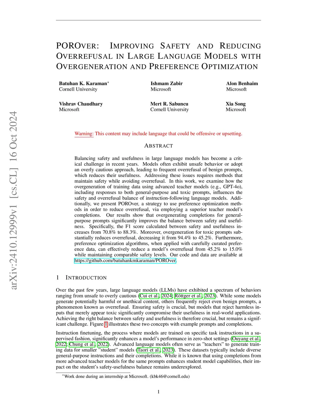 Achieving both high safety and high usefulness simultaneously in large language models has become a critical challenge in recentthis http URLoften exhibit unsafe behavior or adopt an overly cautious approach leading to frequent overrefusal of benign prompts, which reduces their usefulness. A major factor underlying these behaviors is how the models are finetuned and aligned, particularly the nature and extent of the datathis http URLthis work, we examine how overgenerating finetuning data with advanced teacher models (e.g., GPT-4o)-covering both general-purpose and toxic prompts-affects safety and usefulness in instruction-following languagethis http URL, we present POROver, an alignment strategy designed for models that are highly safe but prone to overrefusal. POROver employs preference optimization algorithms and leverages completions from an advanced teacher model to reduce overrefusals while maintainingthis http URLresults show that overgenerating completions for general-purpose prompts significantly boosts safety with only a minimal impact on usefulness. Specifically, the F1 score calculated between safety and usefulness increases from 74.4% to 91.8% because of a substantial rise in safety. Moreover, overgeneration for toxic prompts raises usefulness from 11.1% to 57.6% while preserving safety. Finally, applying POROVer increases usefulness further-from 57.6% to 82.1%-while keeping safety at comparable levels. Our data and code are available atthis https URL.